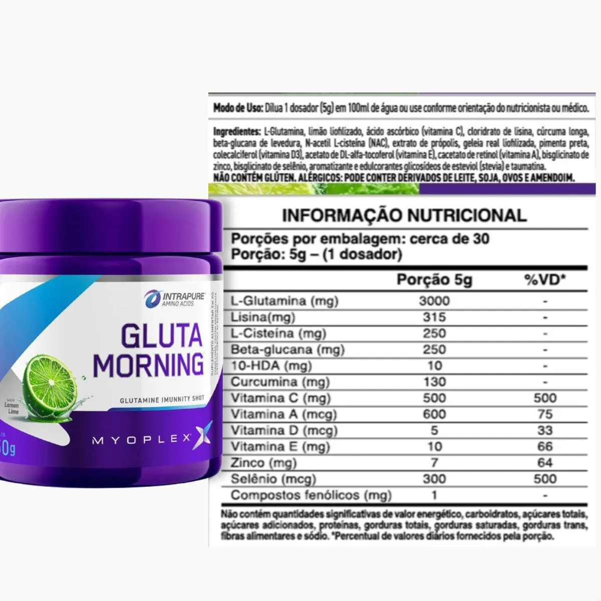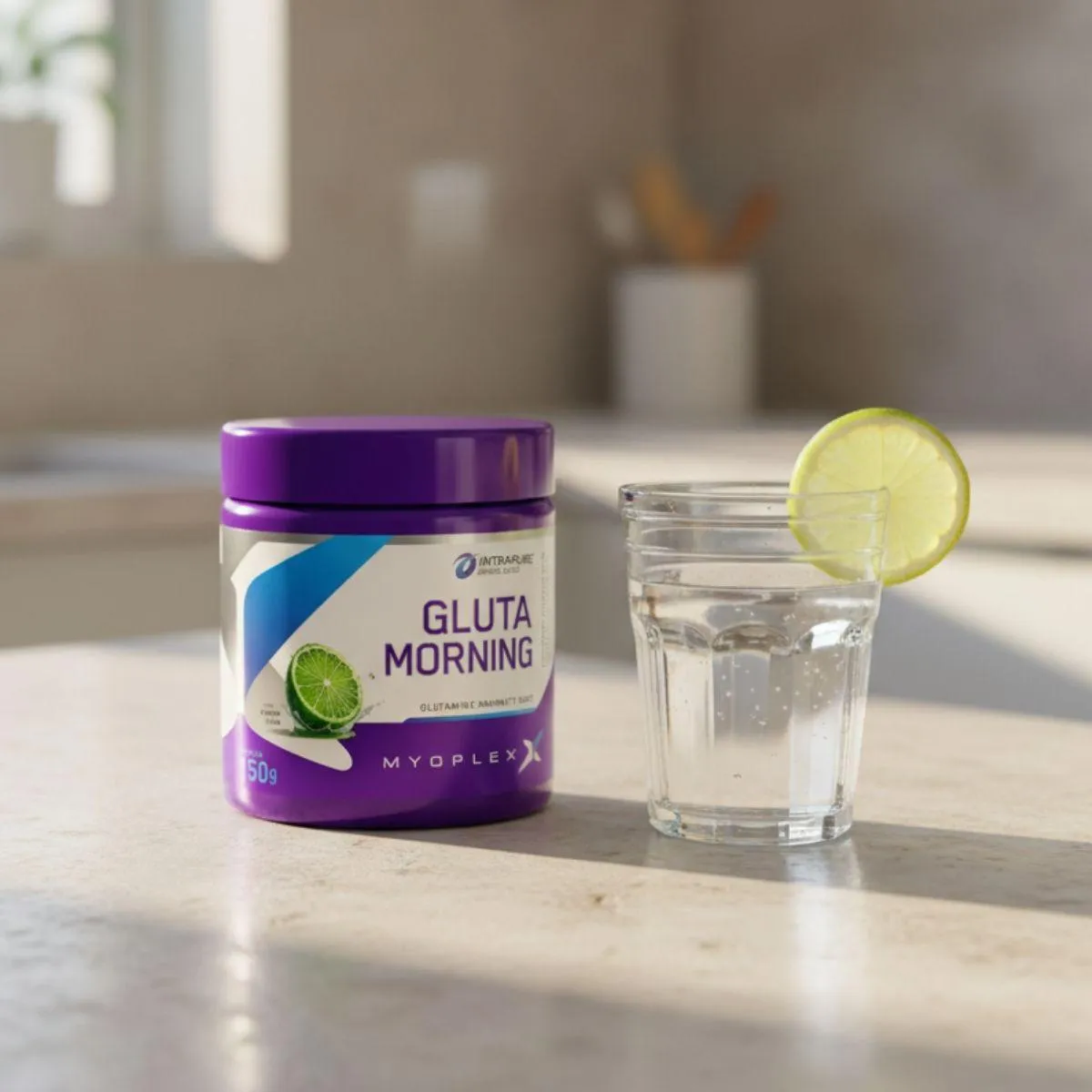 - Pela manhã, prepare o Gluta Morning conforme instruções do rótulo, geralmente misturando o pó em água ou bebida.