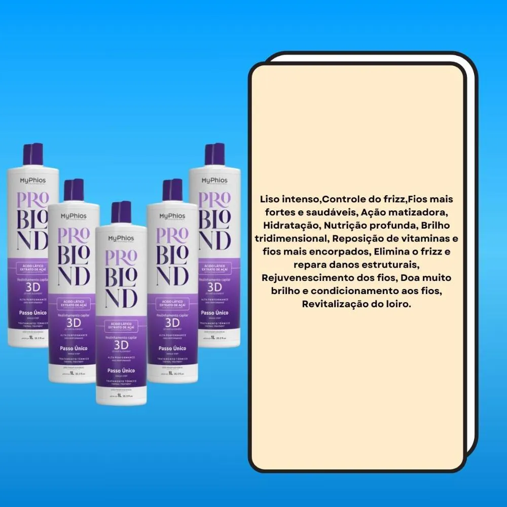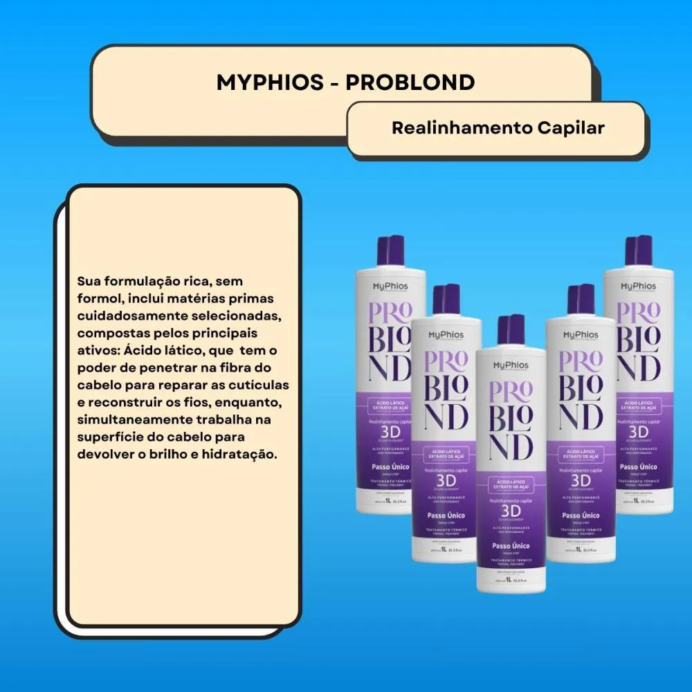 Realinhamento Pro Blond MyPhios é um realinhamento térmico de textura leve, suave e de rápida absorção. Realinhamento orgânica, desenvolvida para cabelos loiros. Transforma cabelos indisciplinados em