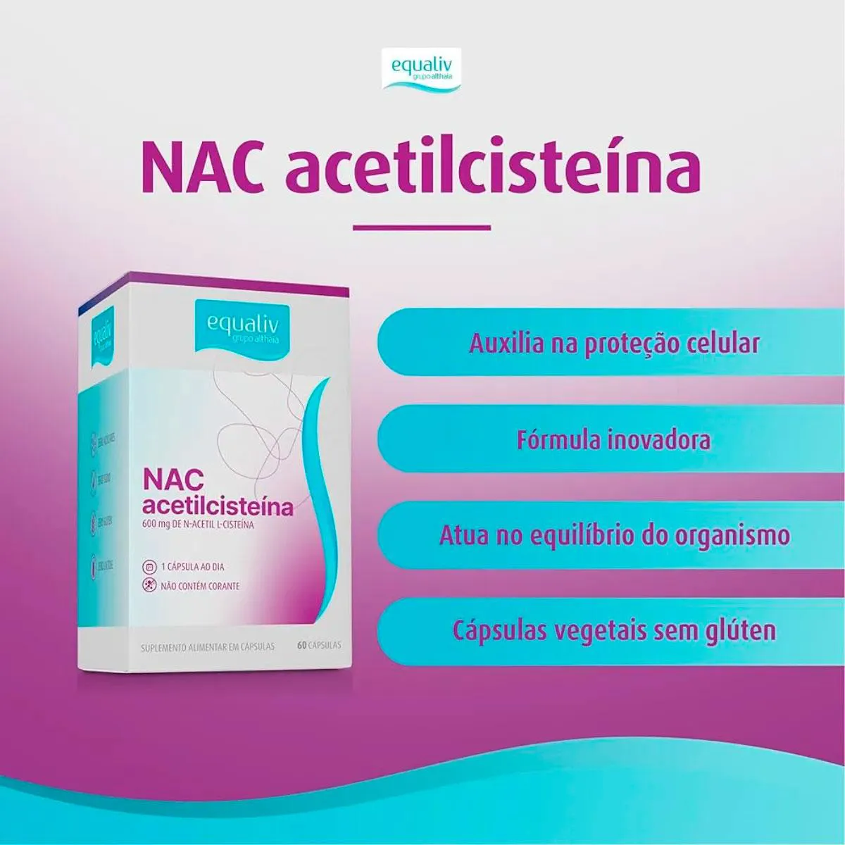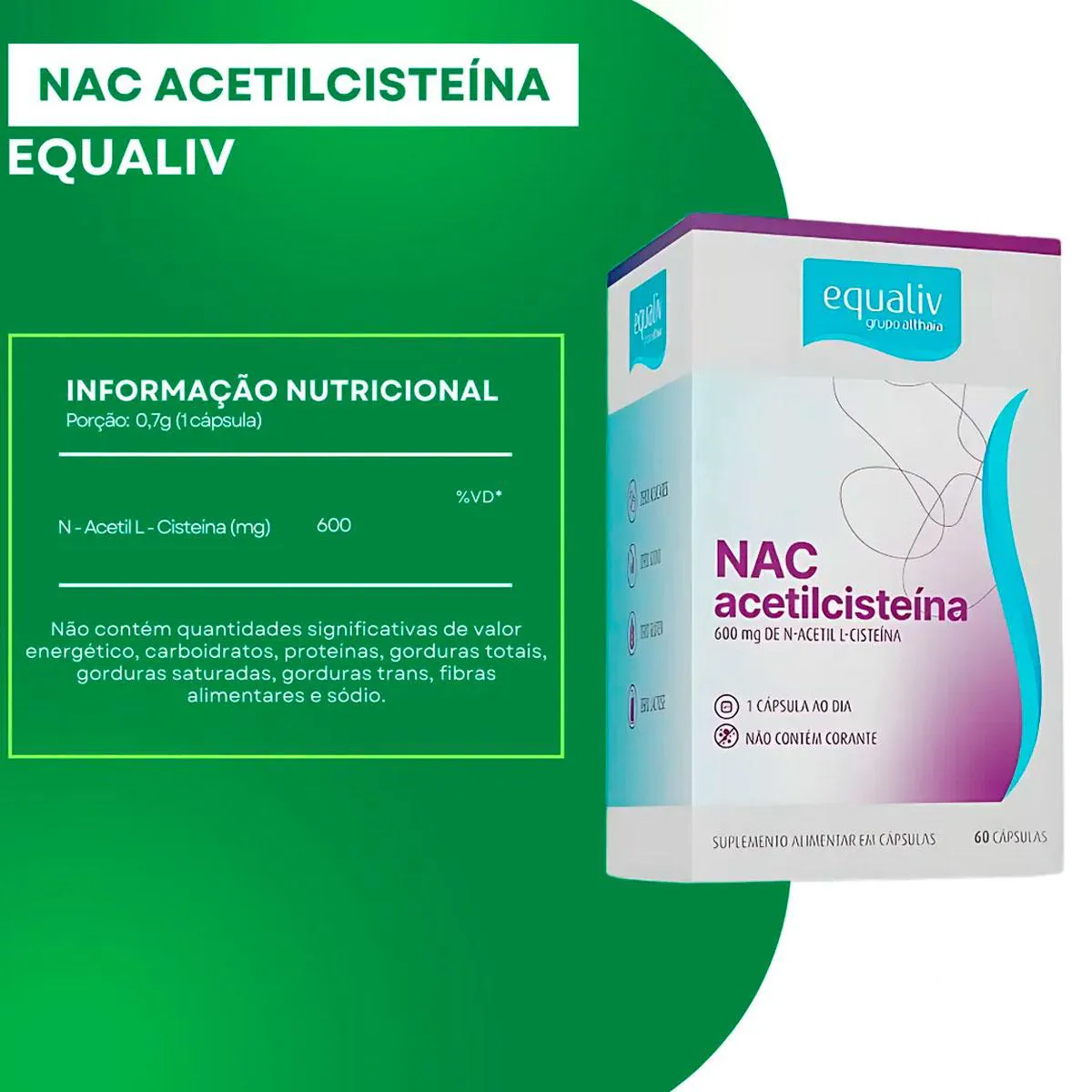 NAC Equaliv é um suplemento alimentar que oferece 600mg de N-acetil-cisteína em cada cápsula. Essa substância é conhecida por ser precursora da glutationa, um importante antioxidante natural do corpo humano. PARA QUEM É INDICADO: Indicado para pessoas que desejam promover a desintoxicação do organismo, equilibrar o sistema antioxidante, melhorar a saúde cardiovascular e potencializar os efeitos do óxido nítrico. É especialmente benéfico para atletas e praticantes de atividade física. Ingredientes: (Acetilcisteína, amido de milho, (estabilizante) croscarmelose sódica, (antiumectante) dióxido de silício, (lubrificante) estearato de magnésio e cápsula vegetal derivada da celulose.) MODO DE USAR: Consumir 1 cápsula ao dia. USO ADULTO. Advertências: "ESTE PRODUTO NÃO É UM MEDICAMENTO" "ESTE PRODUTO É UM SUPLEMENTO ALIMENTAR" "MANTENHA FORA DO ALCANCE DE CRIANÇAS" "NÃO EXCEDER A RECOMENDAÇÃO DIÁRIA DE CONSUMO INDICADA NA EMBALAGEM" Registro no M.S. nº Produto dispensado de registro RDC 240 de 2018