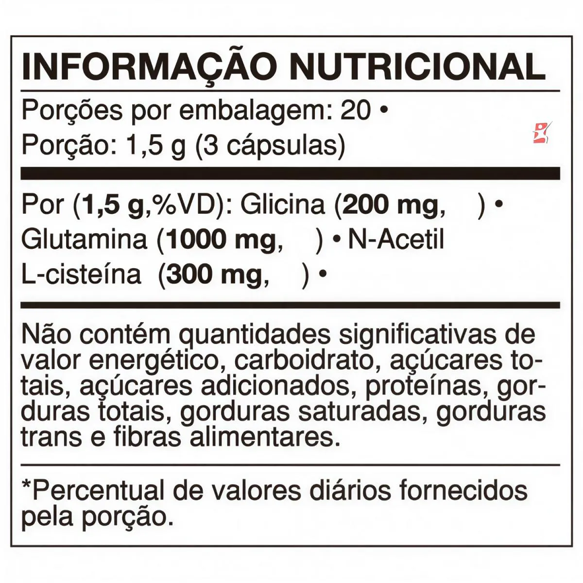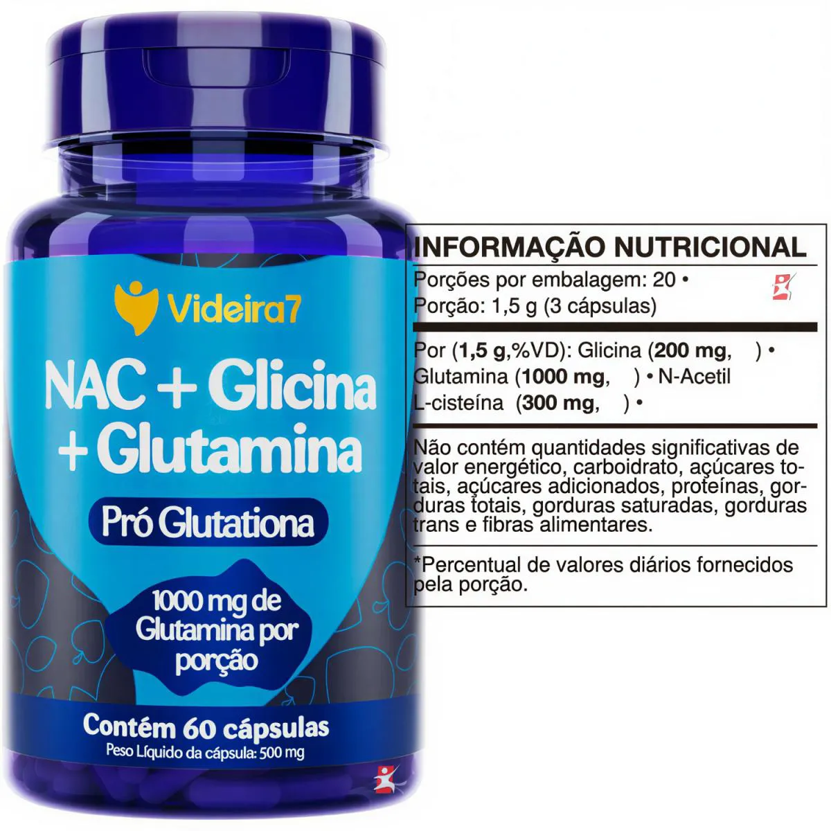 DESCRIÇÃO O que é N-Acetilcisteína (NAC) ? A N-Acetilcisteína é um derivado do aminoácido cisteína. O que é Glicina? A Glicina é um aminoácido. O que é Glutamina? Glutamina é um aminoácido não essencial presente nos músculos. Recomendação de Uso: Consumir 03 cápsulas por dia. TABELA NUTRICIONAL Anexo nas imagens do anúncio. INGREDIENTES: L-Glutamina, glicina, n-acetil L-cisteína e antiumectante Dióxido de silício (INS 551). Composição da cápsula: Gelatina e corante Dióxido de titânio (INS 171). NÃO CONTÉM GLÚTEN. RECOMENDAÇÕES, CUIDADOS & CONSERVAÇÃO “RECOMENDAÇÃO DE USO PARA O GRUPO POPULACIONAL ≥ 19 ANOS”; “ESTE PRODUTO NÃO É UM MEDICAMENTO”; “NÃO EXCEDER A RECOMENDAÇÃO DIÁRIA DE CONSUMO INDICADA NA EMBALAGEM”; “MANTENHA FORA DO ALCANCE DE CRIANÇAS.” “ESTE PRODUTO NÃO DEVE SER CONSUMIDO POR GESTANTES, LACTANTES E CRIANÇAS.” CONSERVAÇÃO: Manter o produto em lugar seco e arejado. Após aberta a embalagem, manter a tampa bem fechada para garantir as características do produto e recomenda-se o consumo em até 90 dias. REGISTRO ANVISA Dispensado de registro conforme RDC 240/2018 Anvisa.