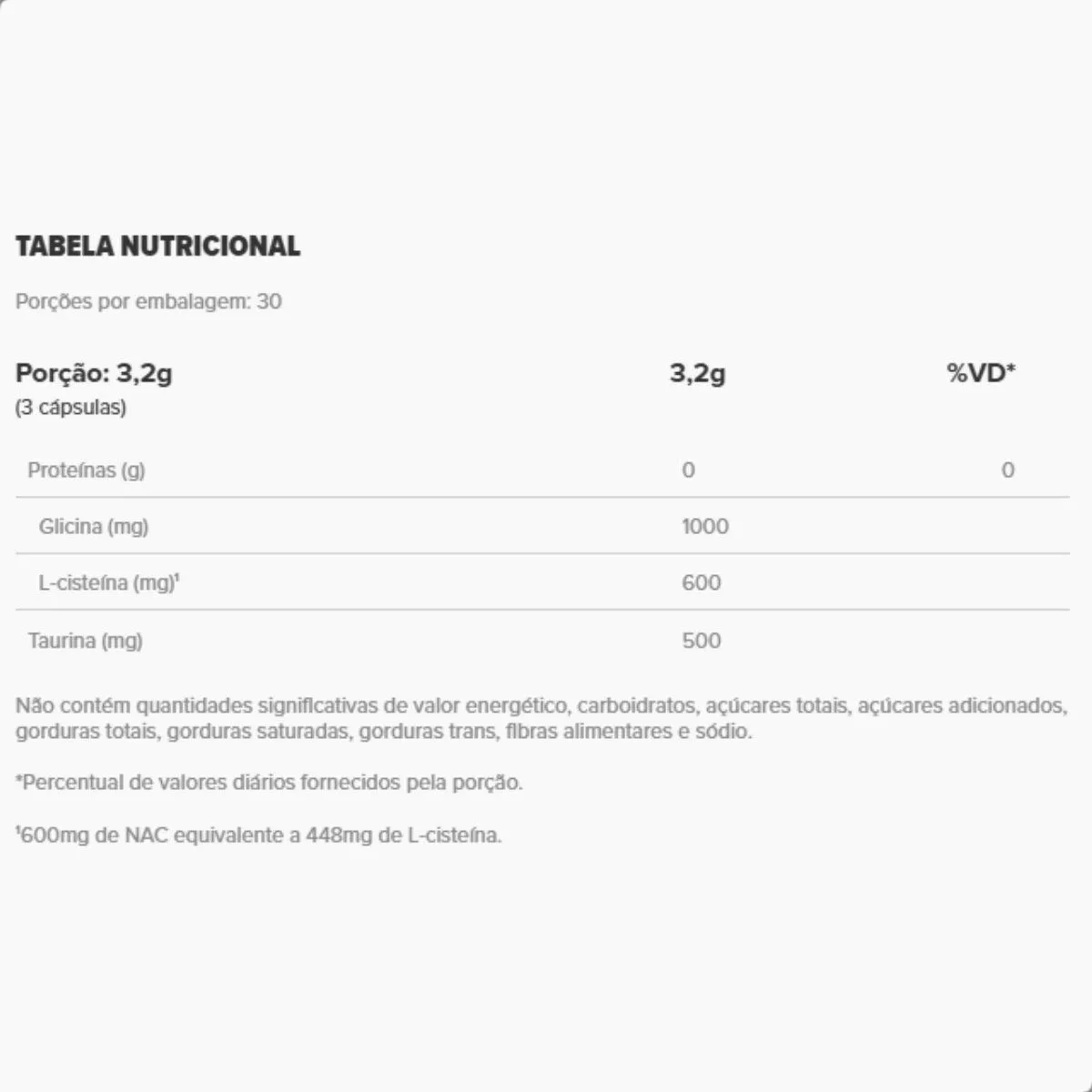 O produto é um suplemento nutricional composto por 90 cápsulas que combinam N-acetilcisteína, glicina e taurina, três aminoácidos precursores do antioxidante glutationa. Trata-se de um suplemento vegano, sem adição de açúcares, corantes artificiais ou glúten, produzido com matérias-primas certificadas. Serve para oferecer apoio nutricional em uma formulação prática, auxiliando no equilíbrio nutricional e bem-estar do organismo, com uma abordagem que integra três aminoácidos importantes em um único produto.