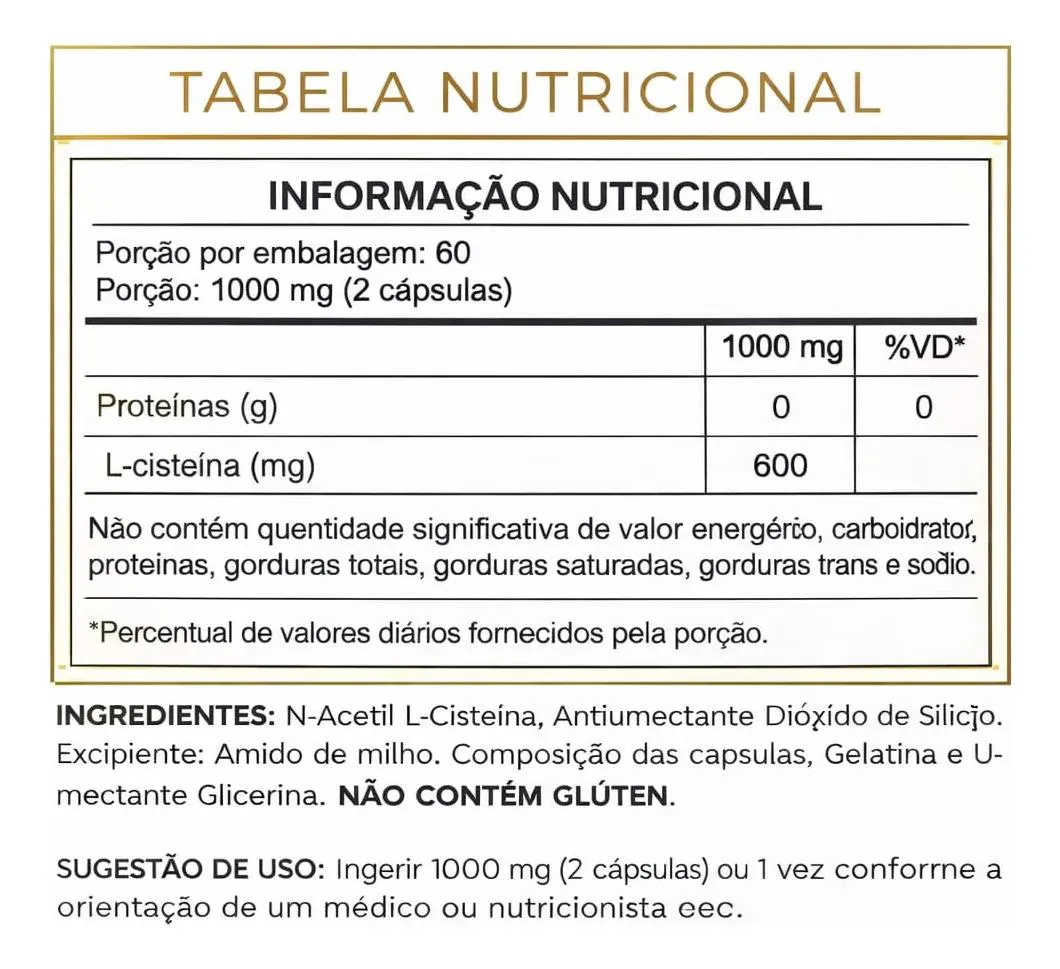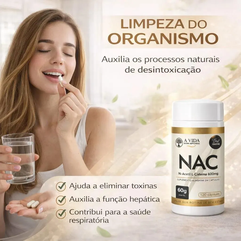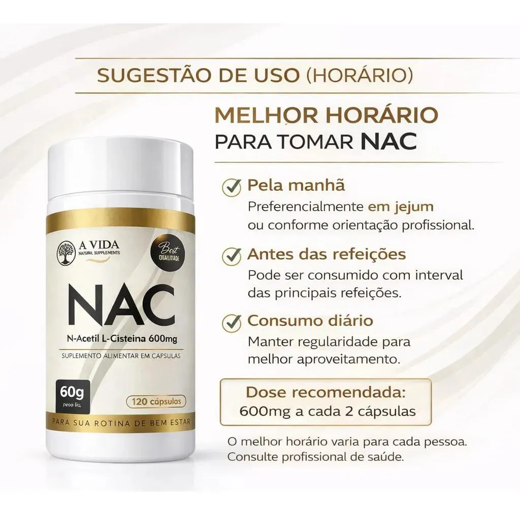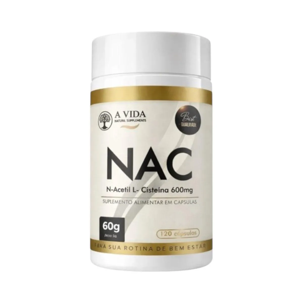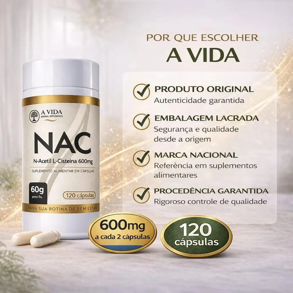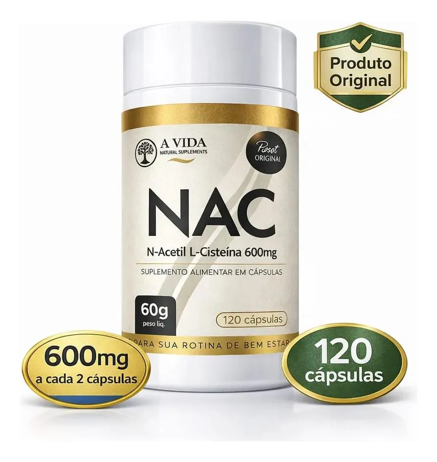 NAC N-Acetil L-Cisteína 600mg A Vida Natural Supplements 120 cápsulas Suplemento alimentar em cápsulas formulado com N-Acetil L-Cisteína, composto derivado da L-cisteína. Produto desenvolvido para complementar a ingestão desse nutriente na rotina diária. INFORMAÇÕES DO PRODUTO * 600mg de N-Acetil L-Cisteína por porção * Porção: 1000mg (2 cápsulas) * 120 cápsulas por embalagem * 60 porções * 60g peso líquido * Cápsulas de fácil ingestão COMPOSIÇÃO Ingredientes: N-Acetil L-Cisteína, antiumectante dióxido de silício. Excipiente: amido de milho. Composição da cápsula: gelatina e umectante glicerina. Não contém glúten. MODO DE USO Ingerir 2 cápsulas ao dia ou conforme orientação de profissional habilitado. INFORMAÇÕES ADICIONAIS Não contém quantidade significativa de valor energético, carboidratos,