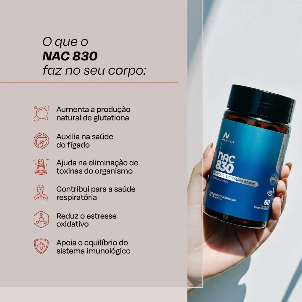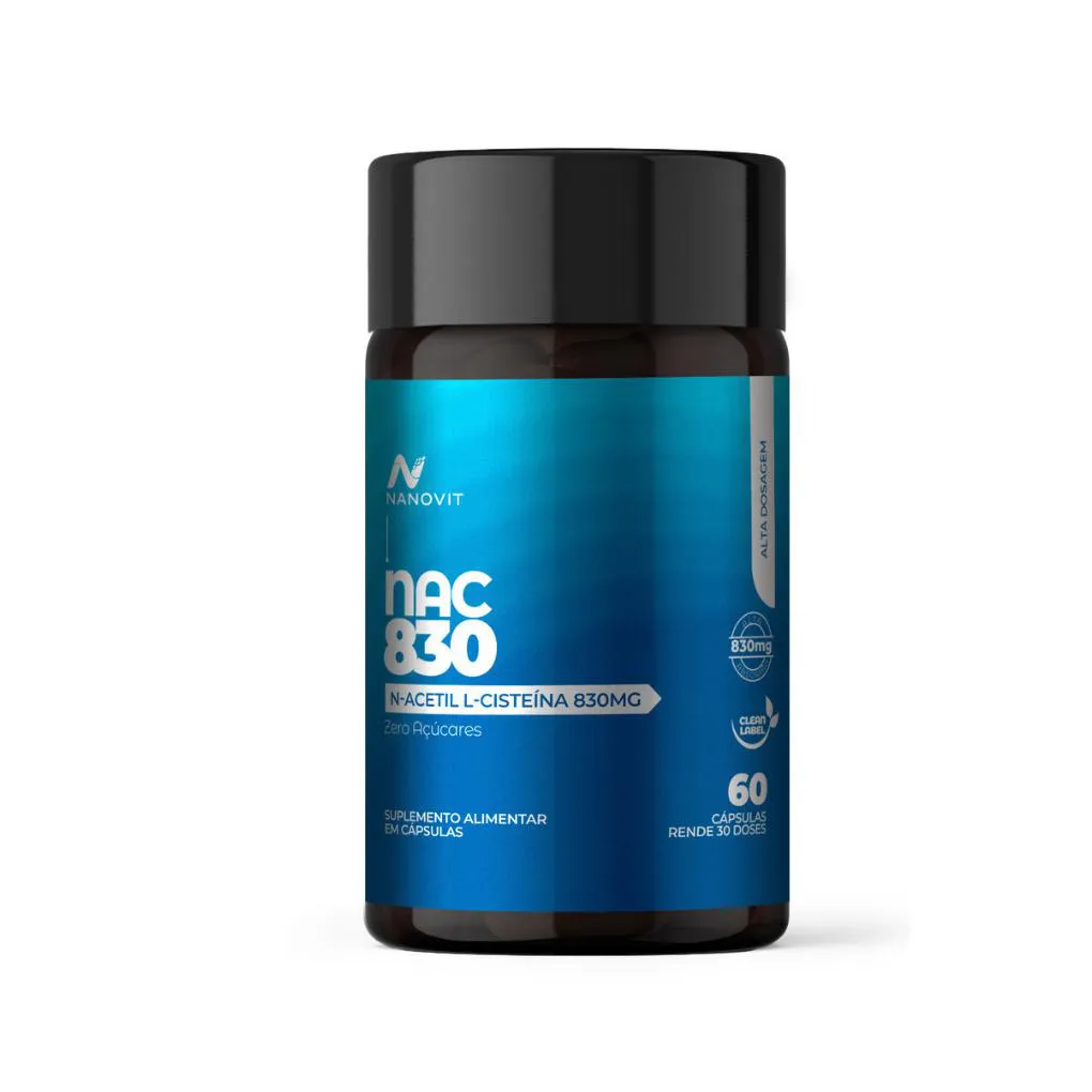 NAC (N-Acetil L-Cisteína) - 830mg - 60 cápsulas – Nanovit O NAC da Nanovit é um suplemento desenvolvido para auxiliar na proteção celular e no equilíbrio do organismo.