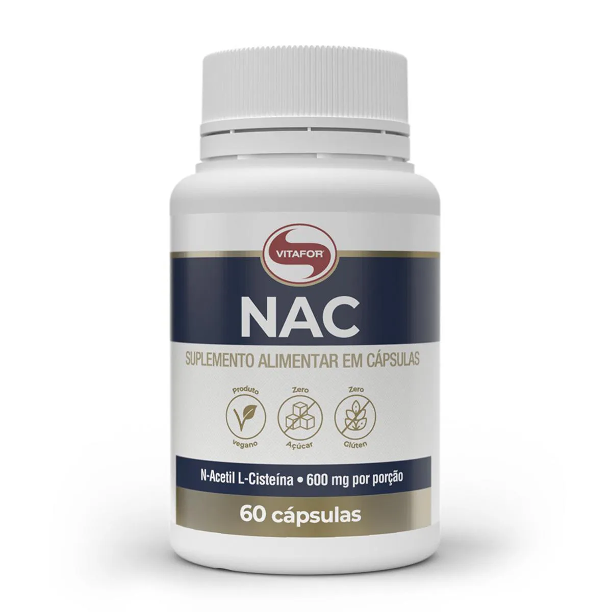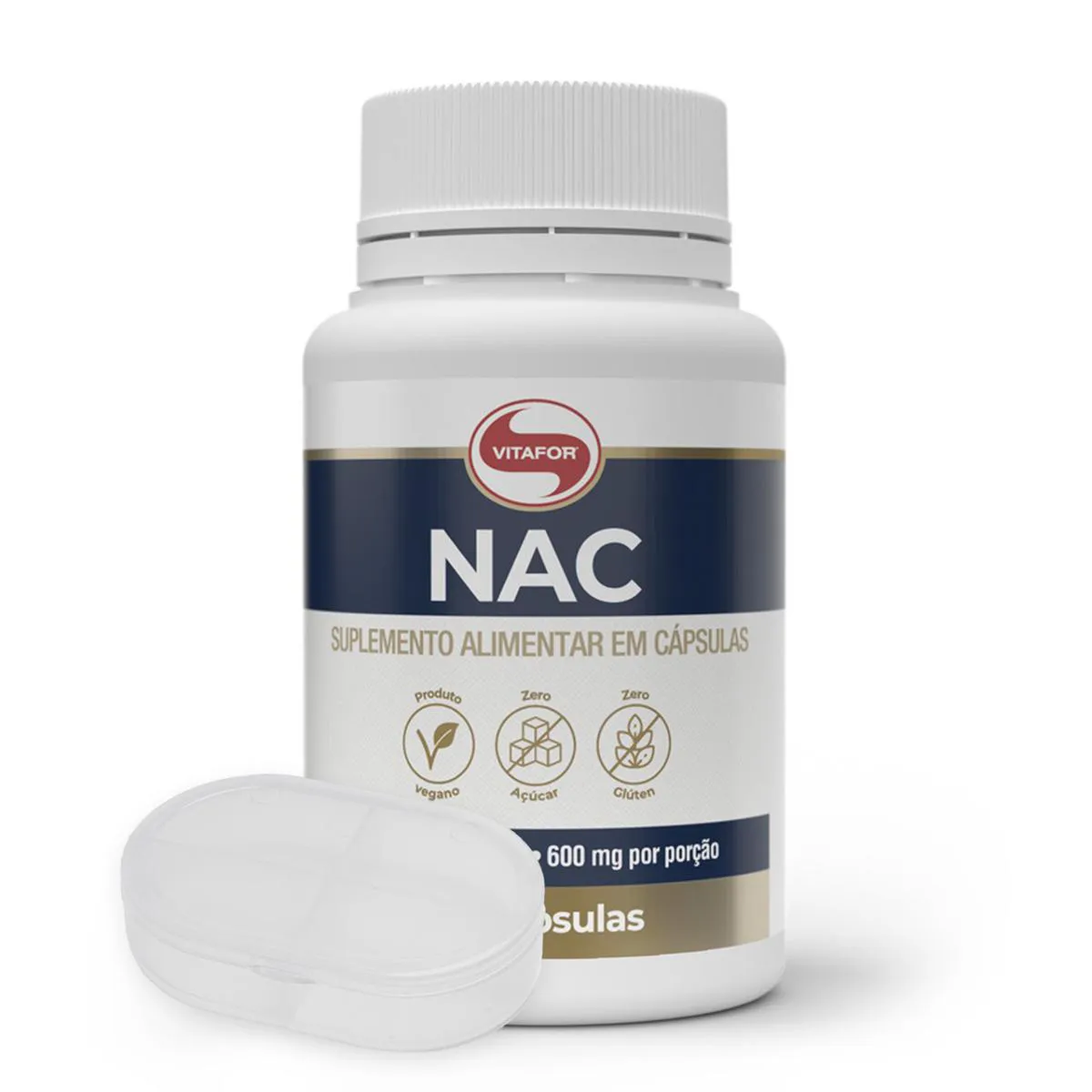NAC N-Acetil L-Cisteína 600mg Vitafor 60 Cápsulas + Porta Cápsulas NAC é um suplemento alimentar composto pelo aminoácido N-acetil L-cisteína (NAC) com concentração de 600mg por cápsula. Diferenciais: - Zero glúten e açúcar.