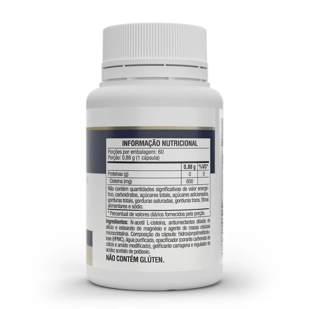 - 100% N-acetil L-cisteína (NAC) isolada. Ingredientes: N-acetil L-cisteína, antiumectantes: dióxido de silício e estearato de magnésio e agente de massa celulose microcristalina. Composição da cápsula: Hidroxipropilmetilcelulose (HPMC), água purificada, corante natural dióxido de titânio, gelificante carragena e conservador acetato de potássio. NÃO CONTÉM GLÚTEN.