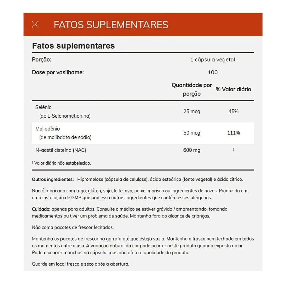 A N-acetilcisteína (NAC) é uma forma estável não essencial do aminoácido L-cisteína. É um aminoácido que contém enxofre e age como estabilizante na formação de estruturas proteicas, além de ser necessário para a formação da glutationa. O Molibdênio e o selênio são minerais traço essenciais que facilitam a produção de diversas enzimas importantes. Uso Sugerido Tome 1 cápsula duas vezes ao dia. Outros Ingredientes Celulose (cápsula), ácido esteárico (fonte vegetal) e ácido cítrico. Não fabricado com ingredientes de trigo, glúten, soja, leite, ovo, peixe, marisco ou nozes. Produzido em uma instalação GMP que processa outros ingredientes que contenham esses alérgenos. Advertências Após aberto, armazene em local fresco e seco. Atenção Produto destinado somente para adultos. Consulte um médico caso esteja grávida/amamentando, tomando algum medicamento ou possua algum problema de saúde. Mantenha fora do alcance de crianças. Não consuma os sachês. Conserve dentro do frasco. Podem ocorrer variações naturais na coloração do produto. Fatos suplementares Tamanho da dose: 1 cápsula Veg Quantidade por porção %Valor diário Selênio (Da L-Selenomethionine) 25 mcg 45% Molibdênio (De Molybdate de sódio) 50 mcg 111% N-Acetil Cisteína (NAC) 600 mg † †Valor diário não estabelecido. Produto isento de registro conforme RDC 27/08/2010
