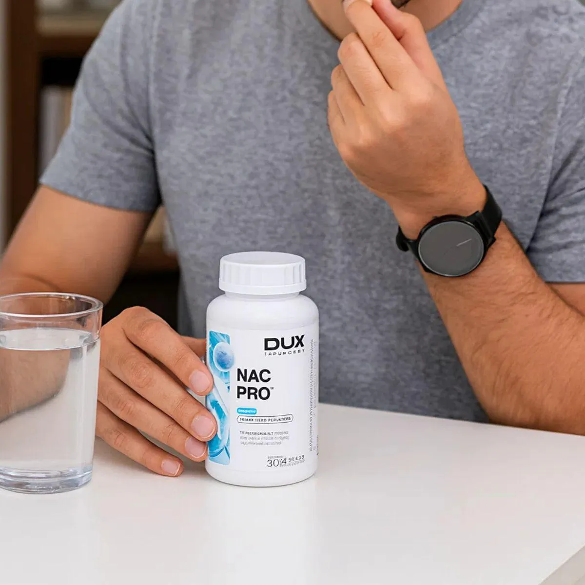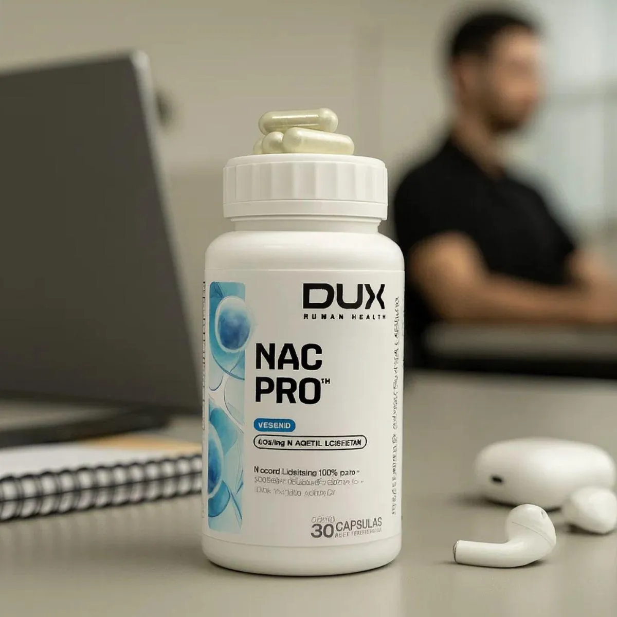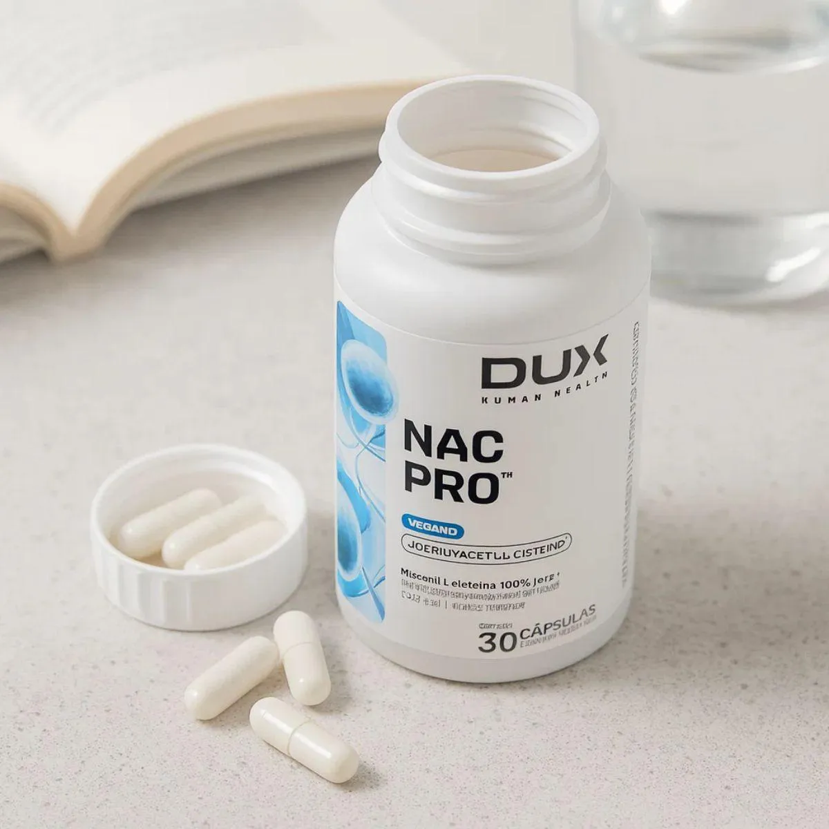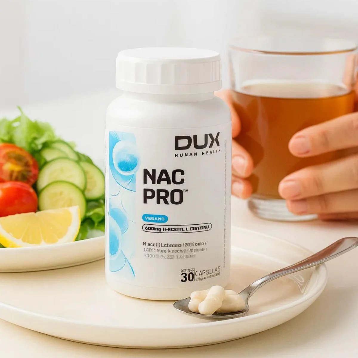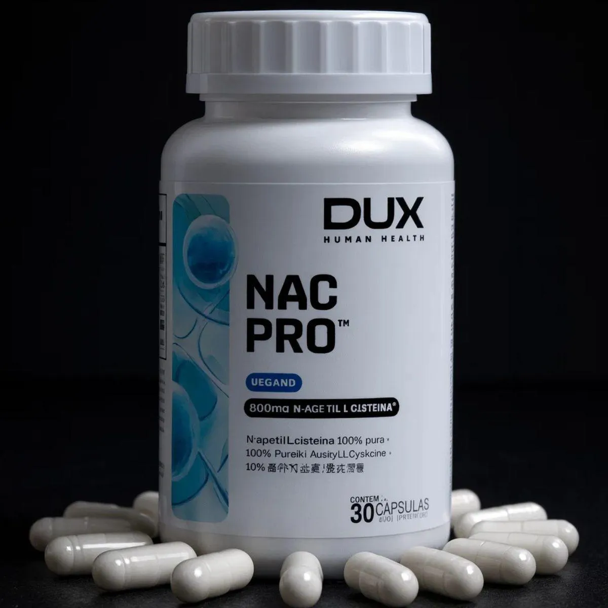 NAC Pro Vegano 600 mg da Dux contém N‑acetilcisteína pura, um derivado do aminoácido cisteína conhecido por seu papel como precursor do glutationa. Cada cápsula vegetal oferece 600 mg de NAC sem adição de aditivos, glúten ou lactose, e é adequada a veganos e vegetarianos.
