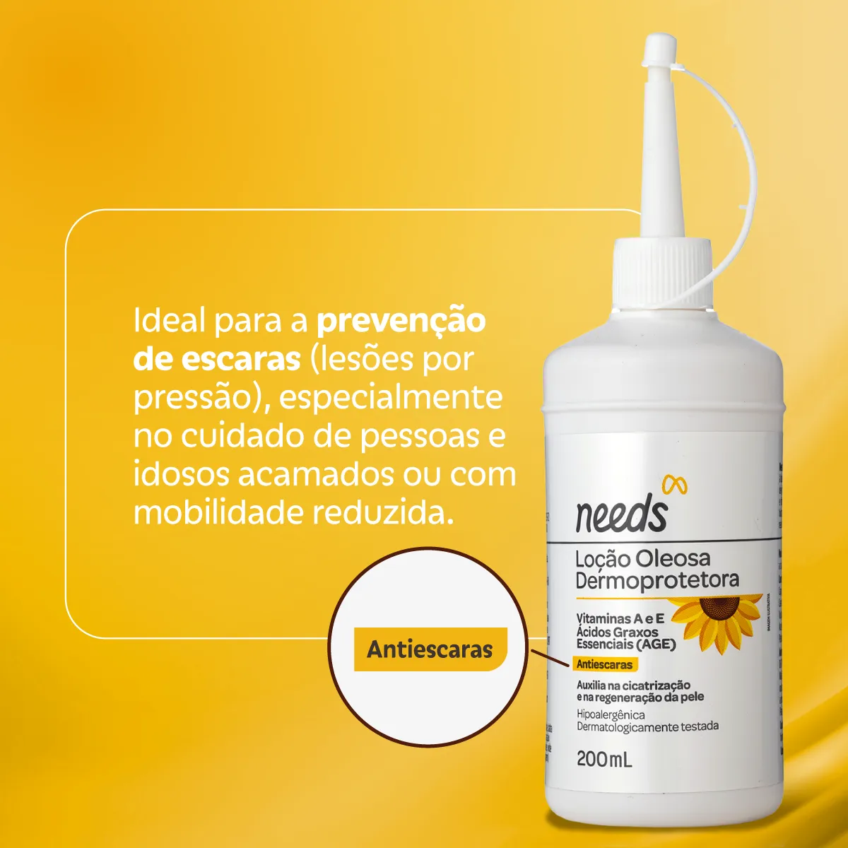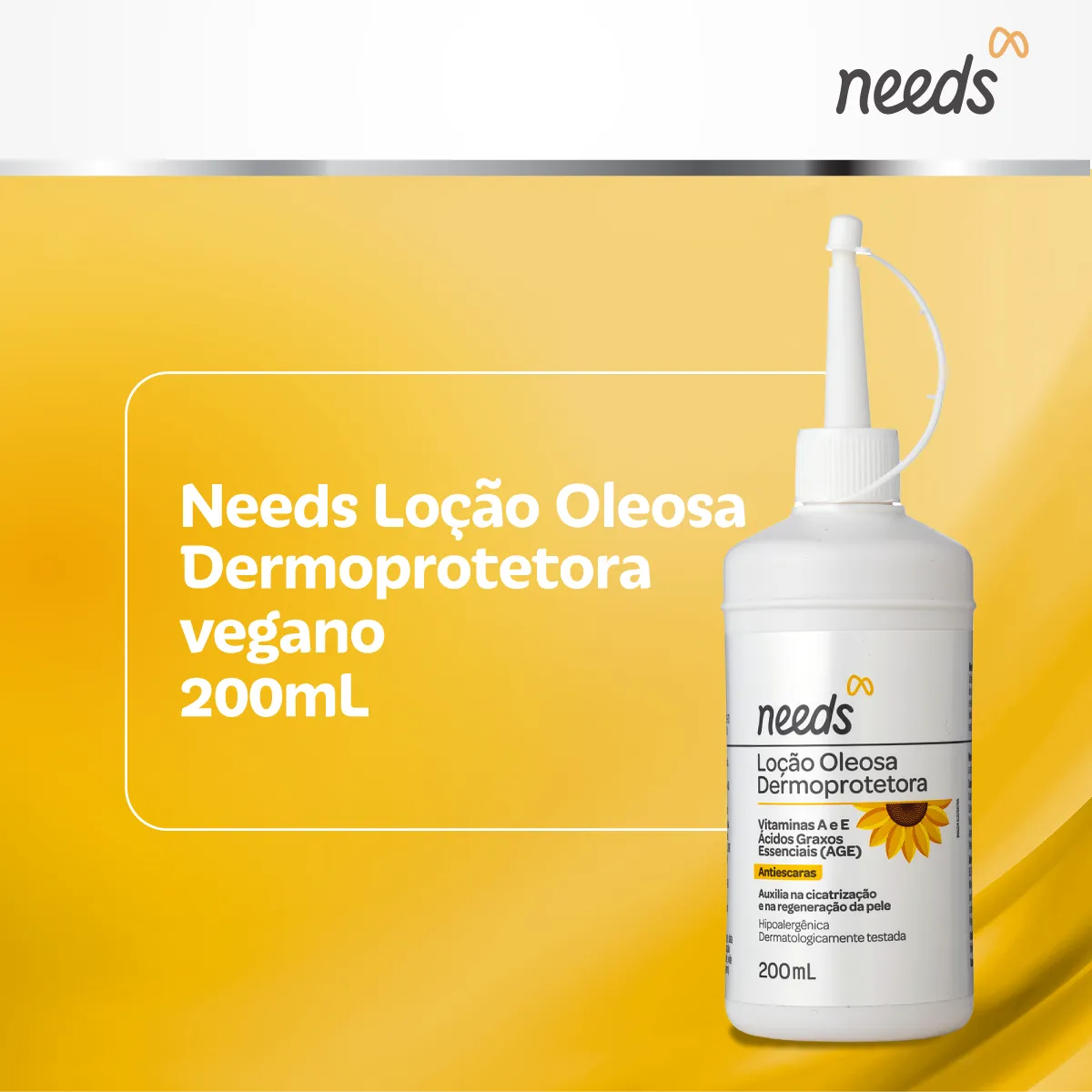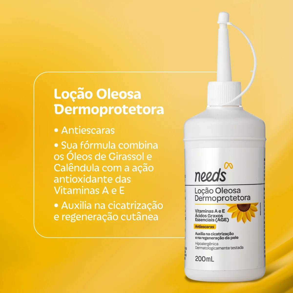 A Loção Oleosa Dermoprotetora Needs Care é um produto cosmético composto por óleos vegetais e vitaminas, formulado com ingredientes como Óleo de Girassol, Óleo de Calêndula, vitamina a e vitamina e. Sua composição natural forma um complexo de nutrientes essenciais para o cuidado da pele.