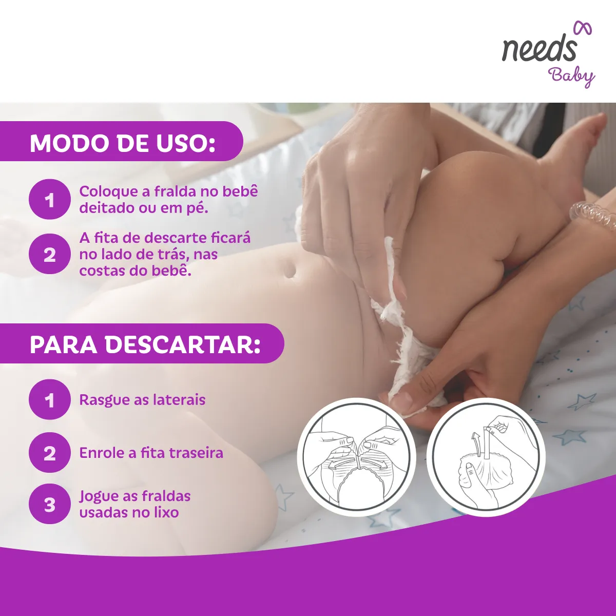 - Para descarte, enrolar a fralda pela parte da frente e prender com as fitas ajustáveis.