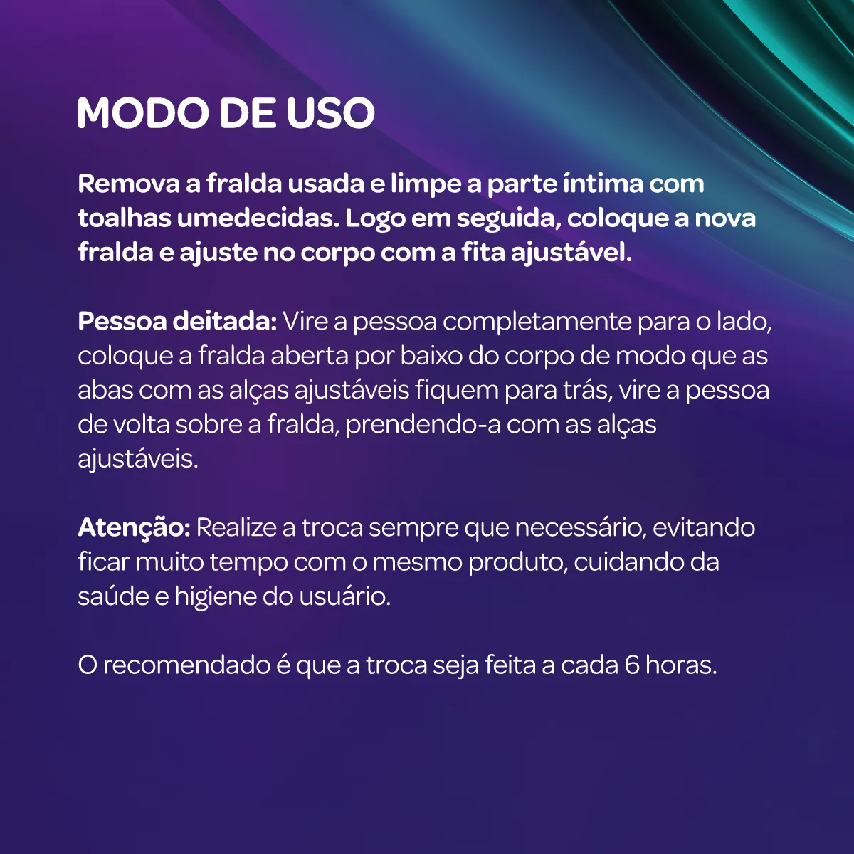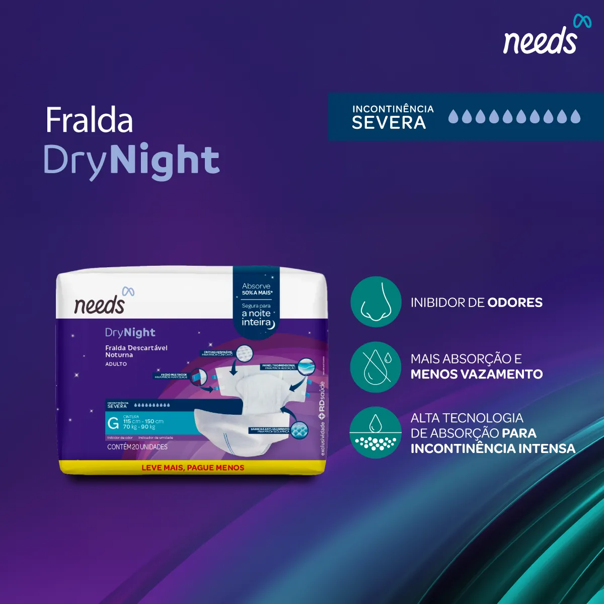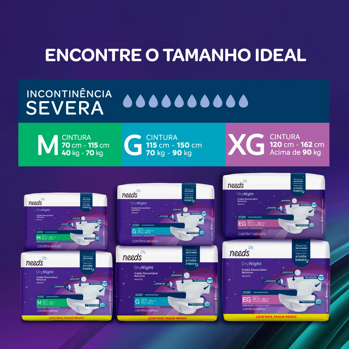 h2Como usar a Fralda Needs Dry Night Adulto?/h2olliRemova a fralda usada e limpe a parte íntima com toalhas umedecidas. /liliLogo em seguida, coloque a nova fralda e ajuste no corpo com a fita ajustável./li/olh3Pessoa deitada: /h3pVire a pessoa completamente para o lado, coloque a fralda aberta por baixo do corpo de modo que as abas com as alças ajustáveis fiquem para trás, vire a pessoa de volta sobre a fralda, prendendo-a com as alças ajustáveis./ph3Atenção:/h3pRealize a troca sempre que necessário, evitando ficar muito tempo com o mesmo produto, cuidando da saúde e higiene do usuário./ppO recomendado é que a troca seja feita a cada 6 horas./ph2Tabela de Medidas/h2tabletbodytrtdpTamanho/p/tdtdpCintura/p/tdtdpPeso/p/td/trtrtdpstrongM/strong/p/tdtdpstrong70 a 115cm/strong/p/tdtdpstrong40 a 70kg/strong/p/td/trtrtdpG/p/tdtdp115 a 150cm/p/tdtdp70 a 90kg/p/td/trtrtdpEG/p/tdtdp120 162cm/p/tdtdpAcima de 90kg/p/td/tr/tbody/tableh2Advertências/h2ulliDescarte no lixo, nunca no vaso sanitário./liliEm caso de alergia ao produto, suspenda o seu uso./liliMantenha fora do alcance de crianças e animais./liliProibido reprocessar. /liliUso único. /liliUso adulto./liliEste produto foi desenvolvido de maneira a minimizar o possível surgimento de alergia. /liliDescontinue o uso em caso de irritação./liliNão compre se a embalagem estiver violada./liliNão jogue a fralda no fogo. /liliA faixa de peso indicada nesta embalagem é apenas uma referência, podendo variar de acordo com a anatomia, os hábitos do adulto e a correta colocação da fralda. /liliSomente para uso externo./li/ul