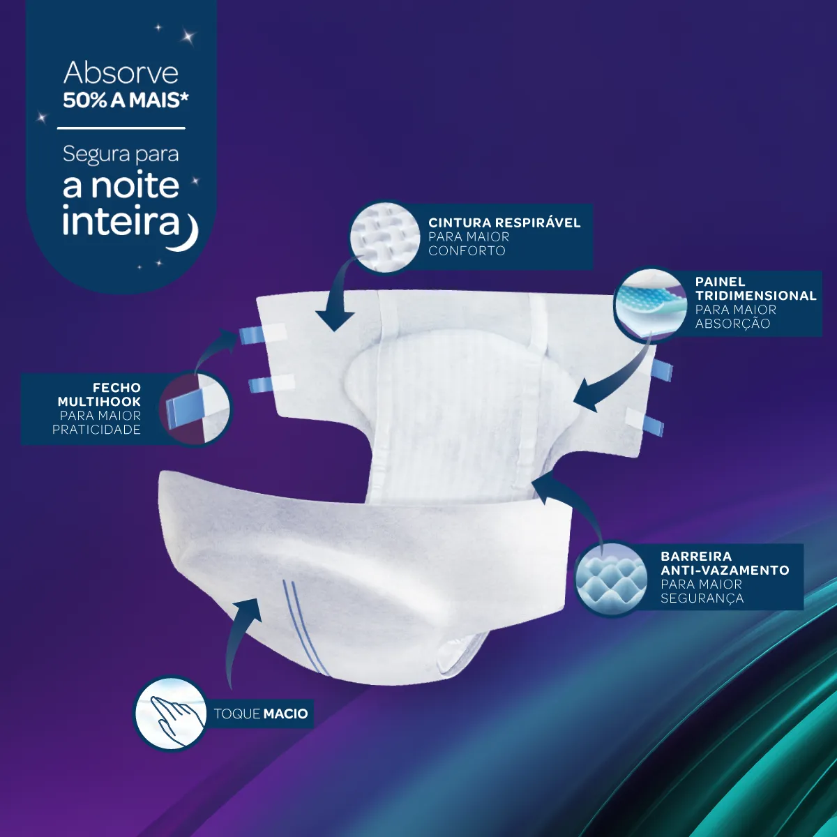 h2O que é a fralda Descartável Needs Dry Night Adulto?/h2pA Fralda Descartável Needs Dry Night para pessoas com incontinência urinária intensa, que mantêm uma vida ativa e buscam mais praticidade no dia a dia. Desenvolvida com tecnologia avançada de absorção, ela possui Transfer Layer, uma camada que auxilia na rápida absorção, evitando o retorno do líquido./ppAlém disso, ela conta com neutralizador de odores, barreiras anti-vazamento, material respirável e cintura ajustável com fita abre e fecha reposicionável. /ppDermatologicamente testada e hipoalergênica, a Needs DryNight oferece excelente proteção e conforto. Absorve 50% a mais comparada a fralda adulto DryCare Needs e segura a noite inteira./p