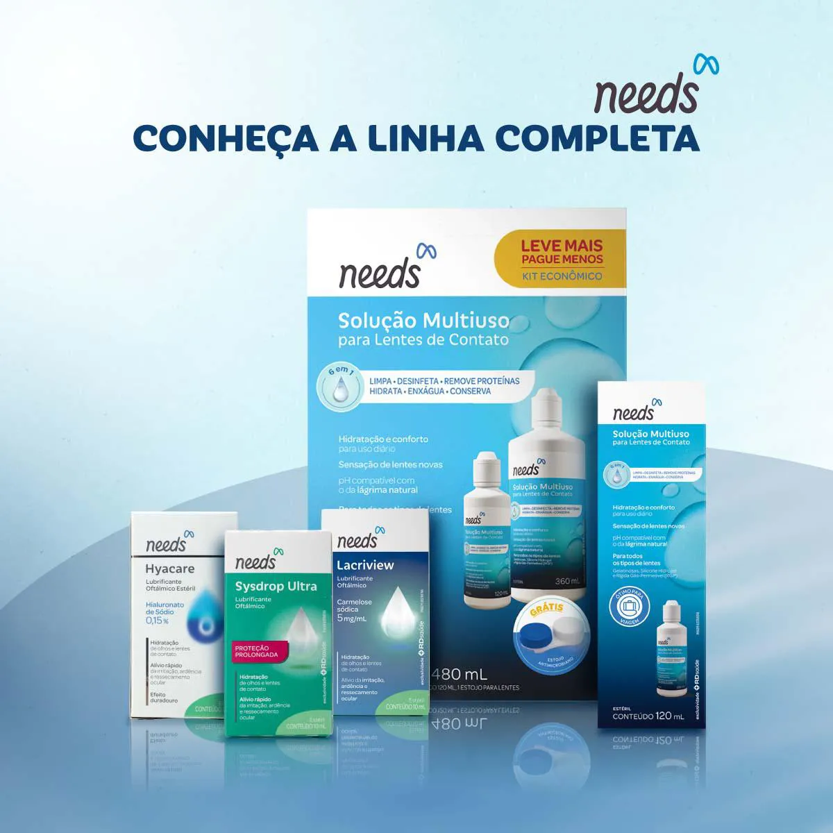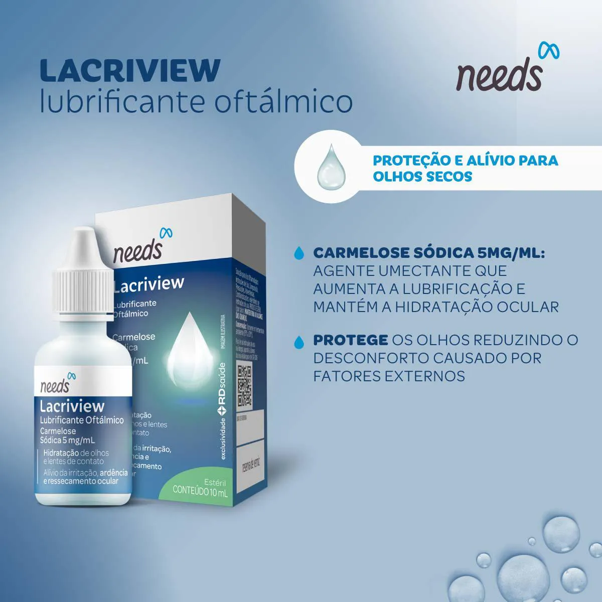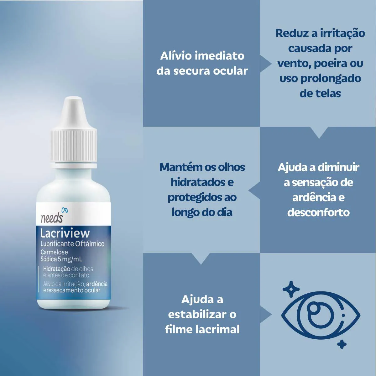 Needs Lacriview é uma solução oftálmica estéril desenvolvida para oferecer lubrificação e hidratação ocular prolongada. Sua fórmula ajuda a estabilizar o filme lacrimal natural, prevenindo a evaporação e proporcionando alívio imediato para olhos secos e irritados.