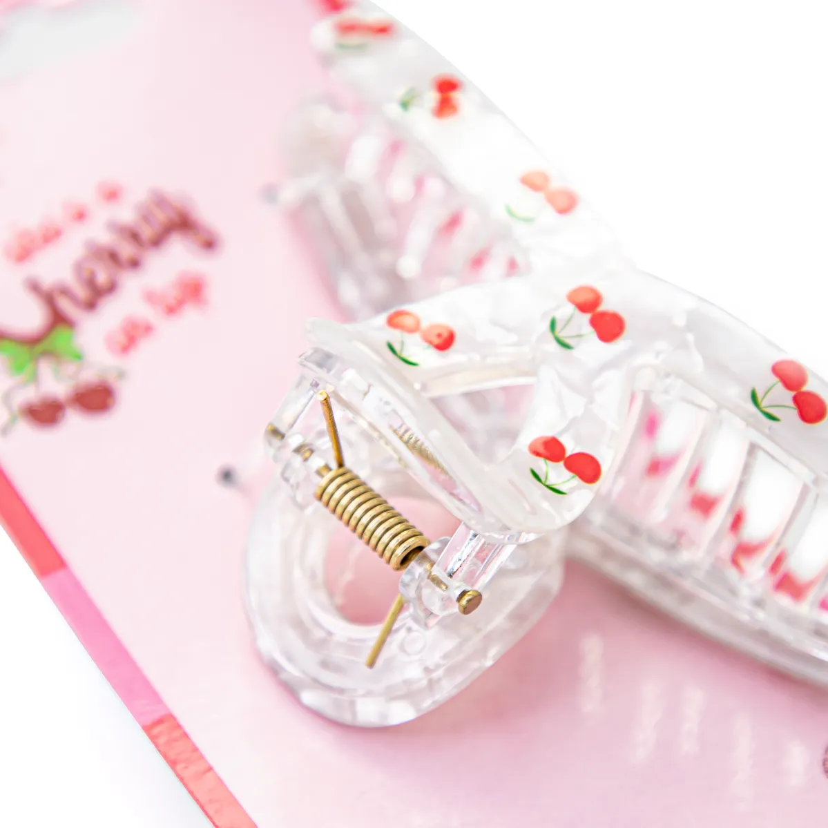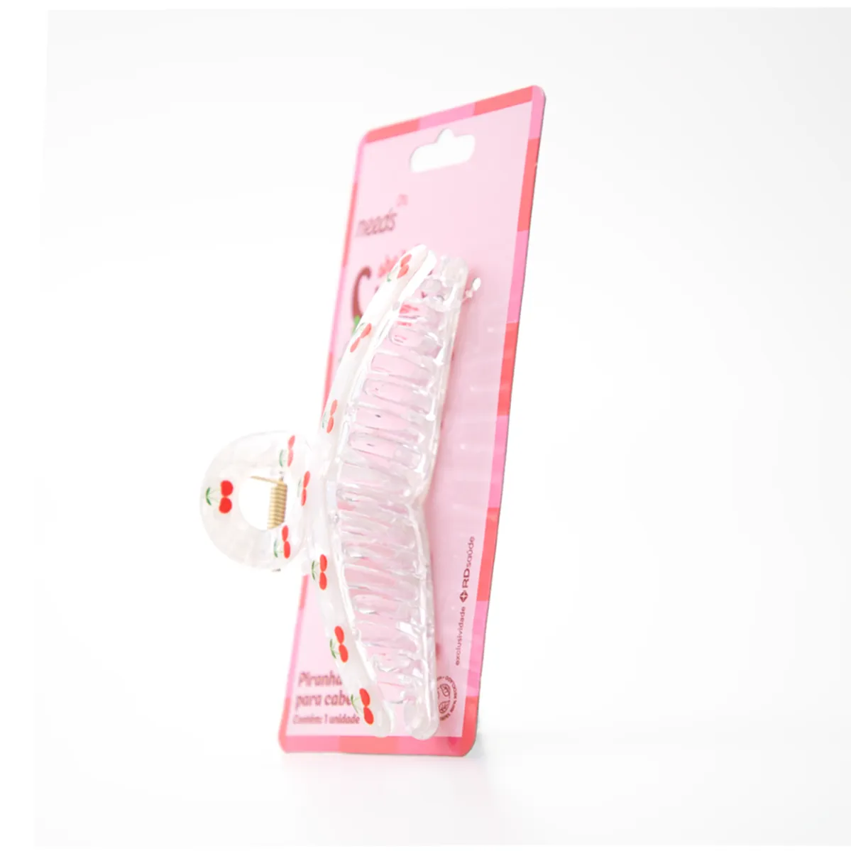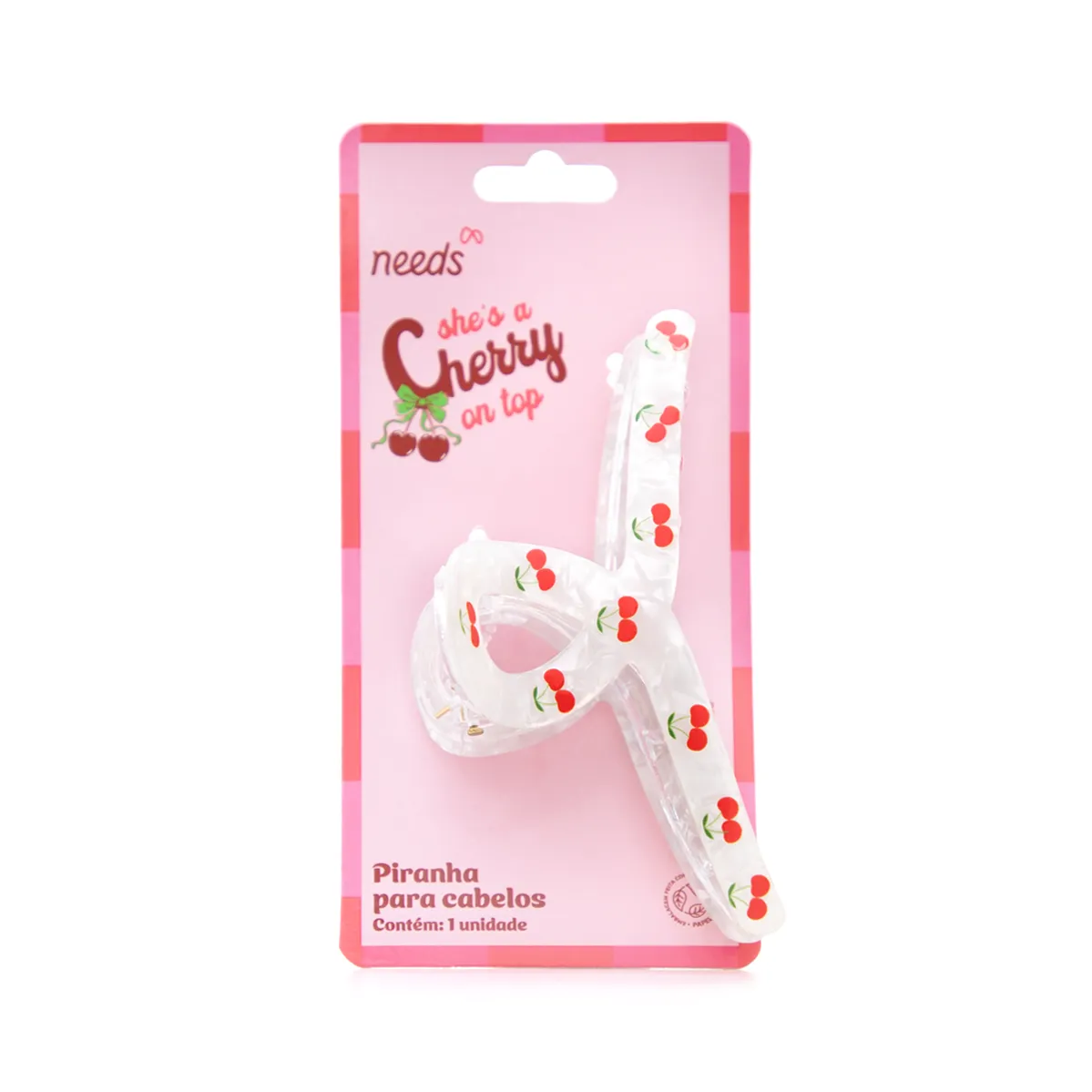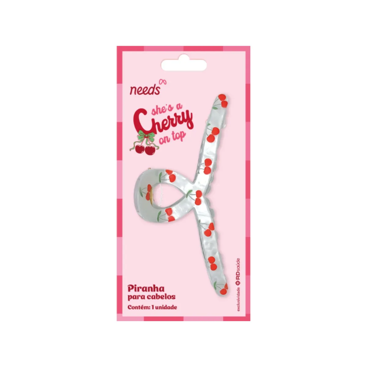 A Piranha de Cabelo Needs Cherry é um acessório de edição limitada, com estampa exclusiva de cereja, ideal para quem busca praticidade e estilo ao prender os cabelos.