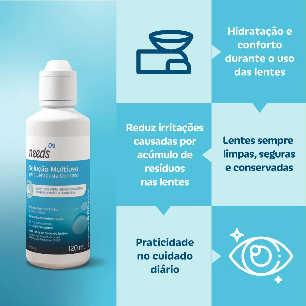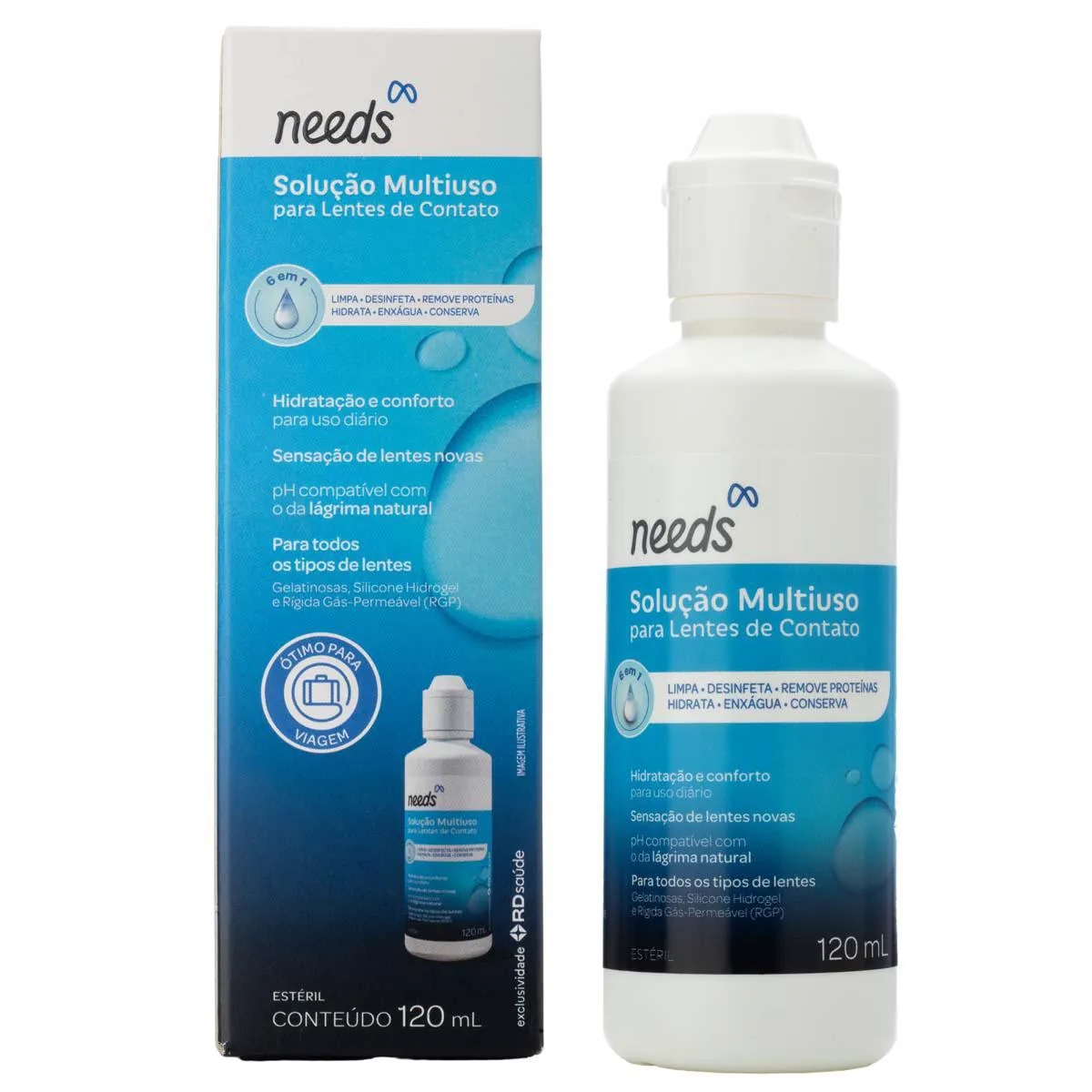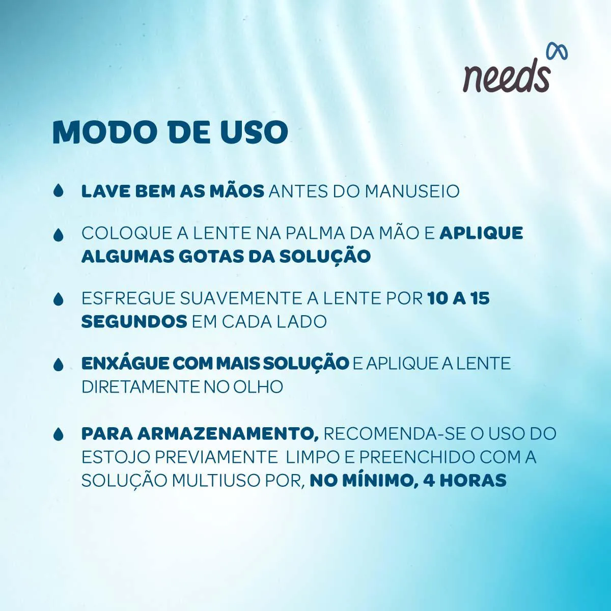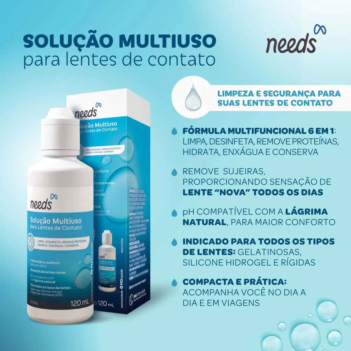 A Solução para Lentes de Contato Multiuso Needs é um produto desenvolvido especificamente para cuidados completos com lentes de contato gelatinosas. Trata-se de uma solução líquida que permite múltiplas funções de manutenção das lentes.