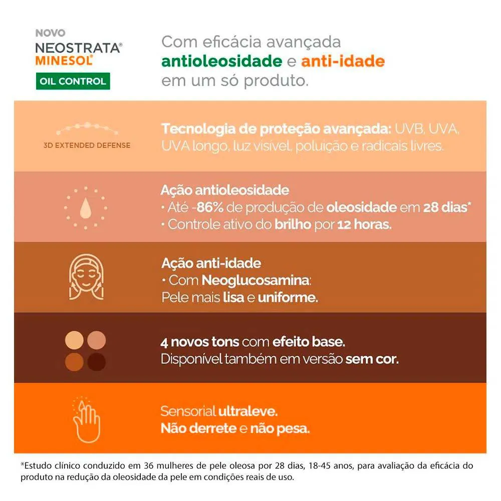 Neostrata Minesol Oil Control FPS70 proporciona proteção solar de amplo espectro com ação antioleosidade e anti-idade.