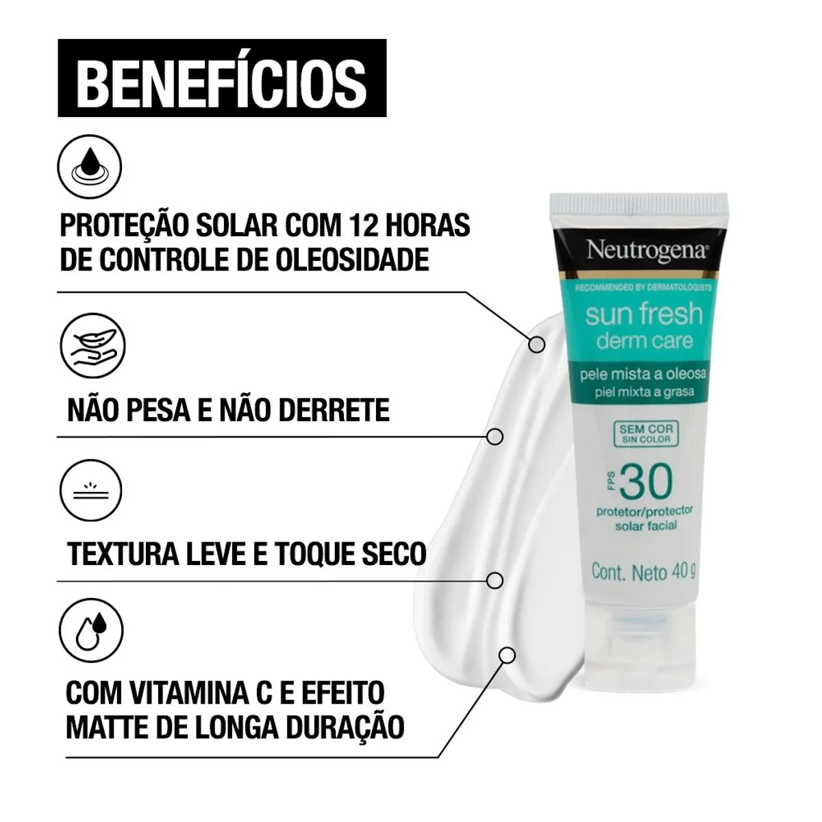 Recomendado por dermatologistas, o protetor solar Neutrogena Sun Fresh Derm Care é não comedogênico, ou seja, não obstrui poros, além de garantir controle da oleosidade por até 12 horas.