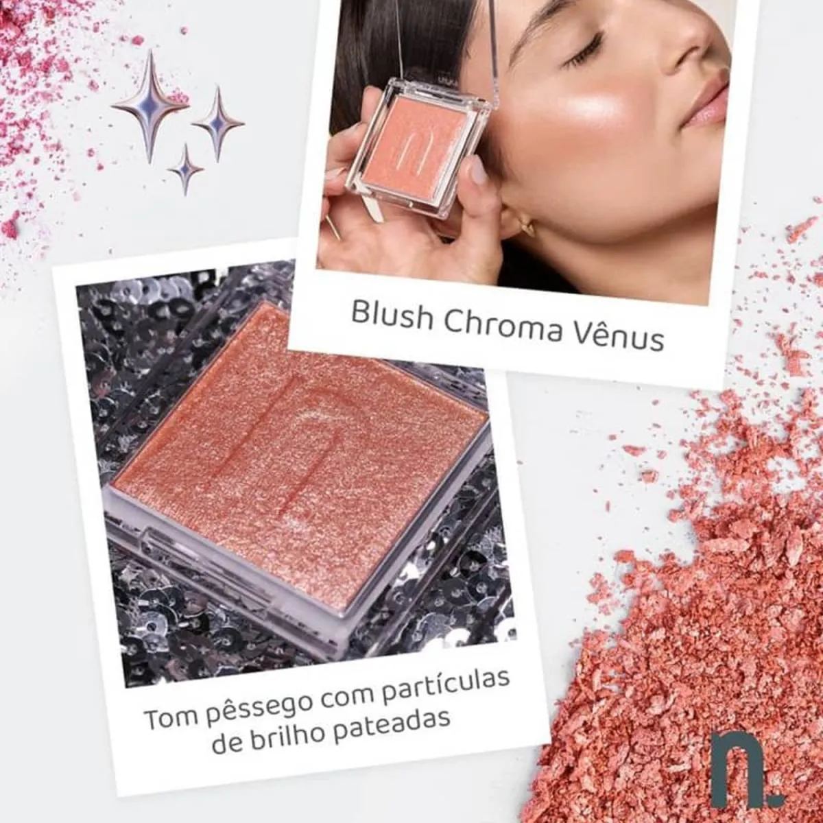 O Blush Galaxy Chroma Glow Nina Makeup realça a pele com cor vibrante e brilho sedoso, unindo pigmento fino e efeito glow sofisticado.