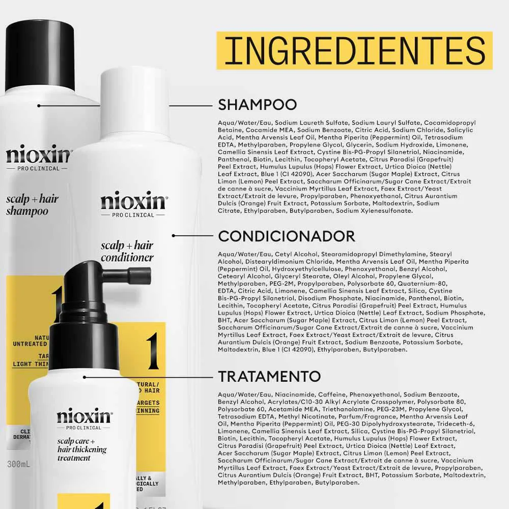 - O Sistema 1 de Nioxin é um tratamento profissional completo de espessamento para cabelos naturais com afinamento leve.