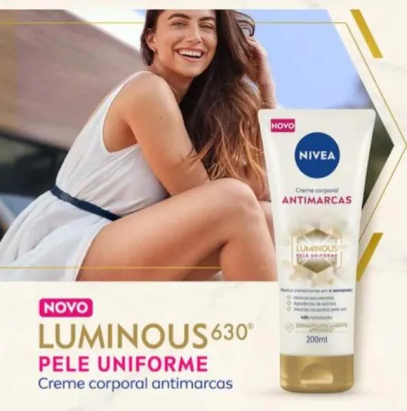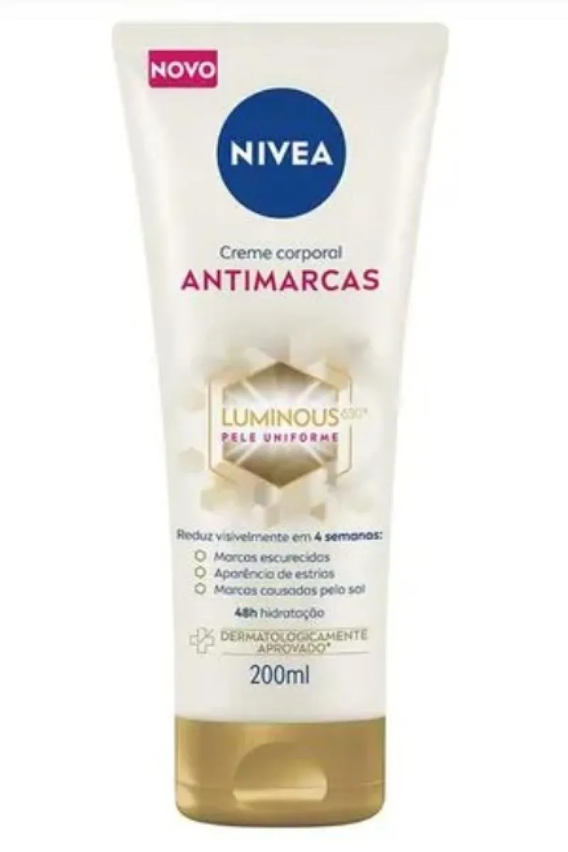 Nivea Luminous 630® Creme Corporal Antimarcas é um hidratante que age por 48 horas na pele enquanto combate marcas escurecidas, estrias, marcas de sol, deixando o tom uniforme em 4 semanas de uso. Seu uso contínuo previne o surgimento de novas marcas.