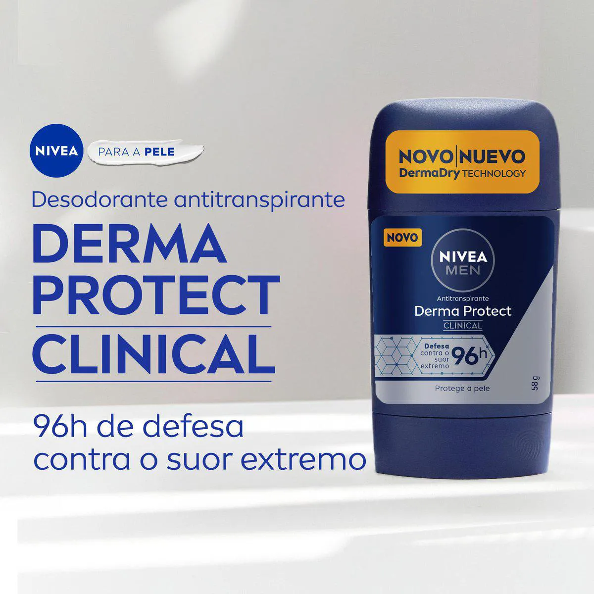 O Nivea Men Derma Protect Clinical é um desodorante antitranspirante em formato stick que oferece proteção máxima por até 96 horas contra o suor e o mau odor. Desenvolvido especialmente para peles masculinas, sua fórmula garante eficácia sem agredir, irritar ou manchar a pele das axilas.