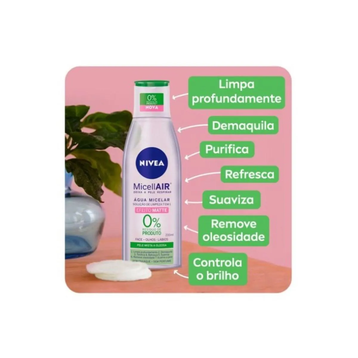 MicellAIR Água Micelar Solução de Limpeza 7 em 1da Nivea foi desenvolvido com tecnologia micelar em uma fórmula poderosa que limpa profundamente sem deixar resíduos de produto na pele e sem sensação oleosa, aumentando a absorção do oxigênio pela pele, deixando-a respirar de novo. Benefícios: - Limpa profundamente - Demaquila - Tonifica - Refresca - Suaviza - Hidrata - Acalma a pele - 0% Resíduo de Produto Modo de Usar: - Limpeza Use pela manhã e à no