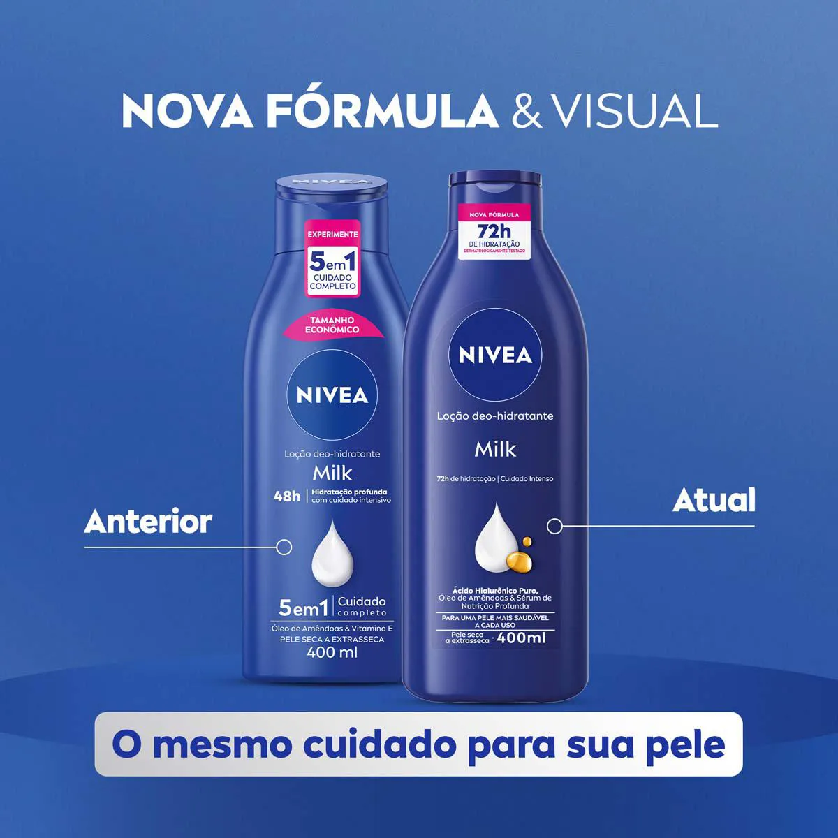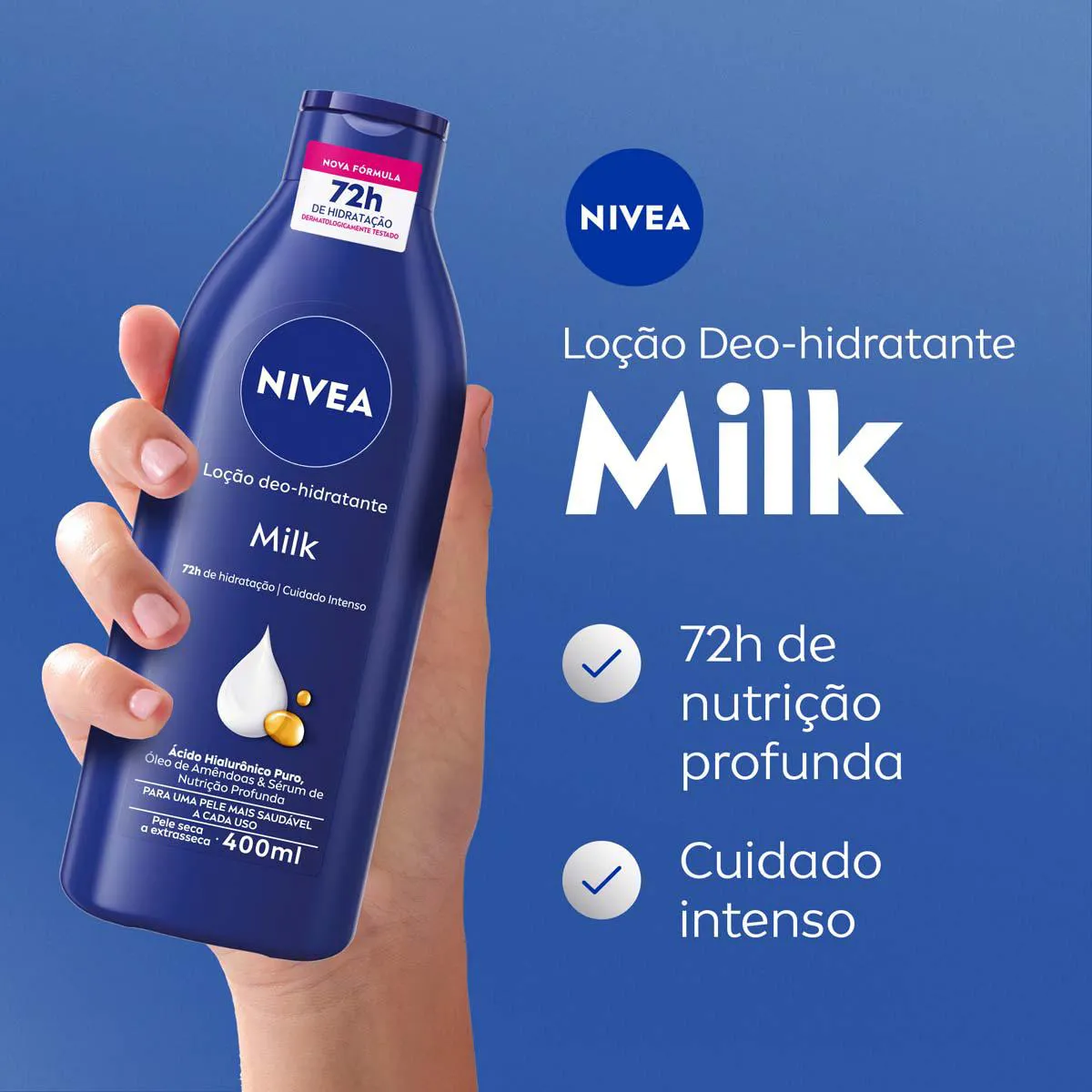 A Loção Hidratante Nivea Milk possui na sua fórmula, alto poder de hidratação com Óleo de Amêndoas e minerais Naturais. Age profundamente reduzindo o ressecamento e a aspereza da pele extrasseca. Com a exclusiva tecnologia Hydra QI, que hidrata de dentro pra fora por mais de 24 horas e estimula a formação de novas aquaporinas, o sistema de hidratação natural da própria pele.