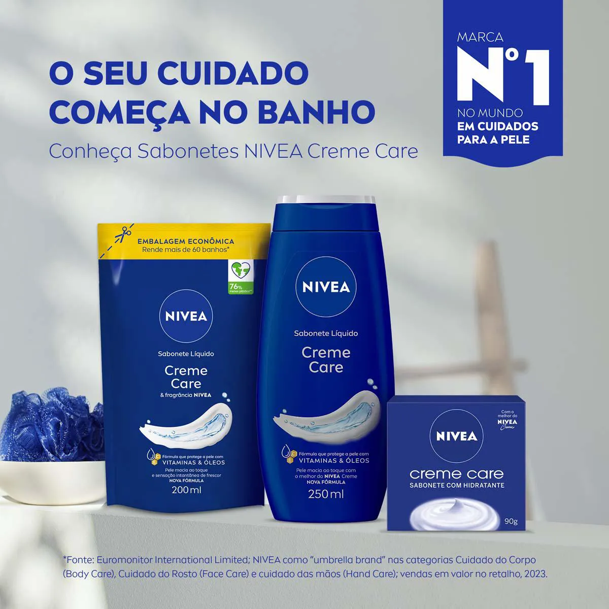 Nivea Creme Care é um sabonete em barra com uma fórmula especial que contém Eucerit que promove a sensação de pele intensamente macia e hidratada. Indicado para todos os tipos de pele, o sabonete em barra Nivea Creme Care é dermatologicamente testado e está disponível em embalagem com 90g.