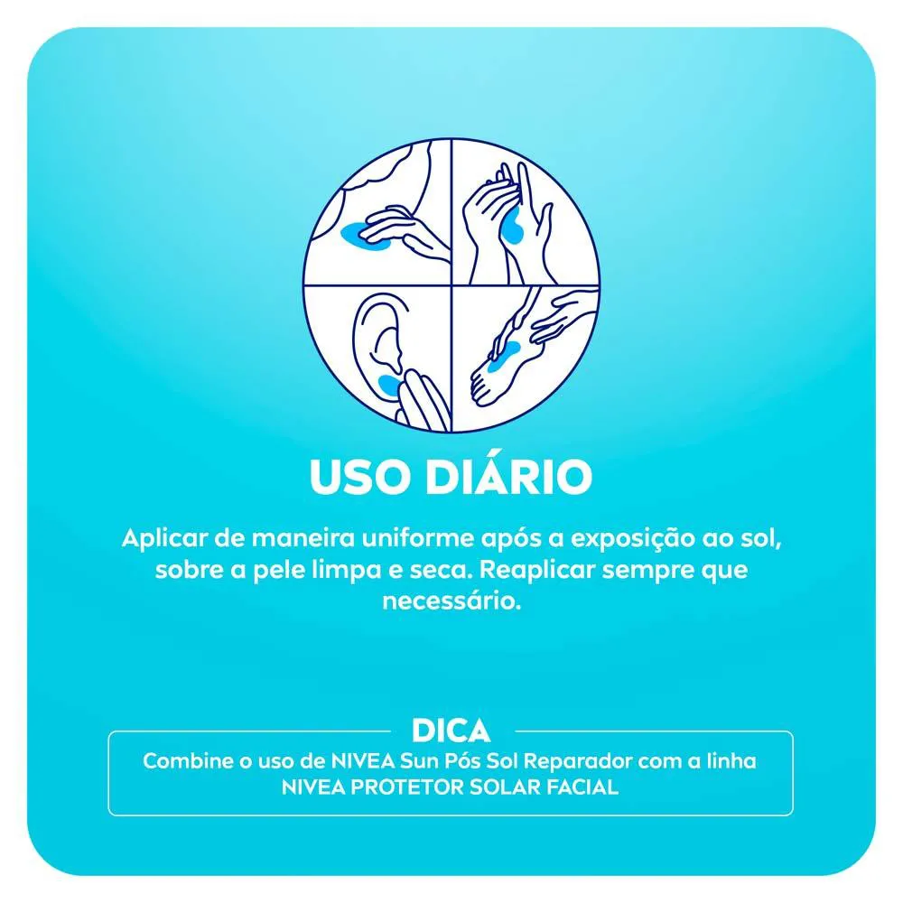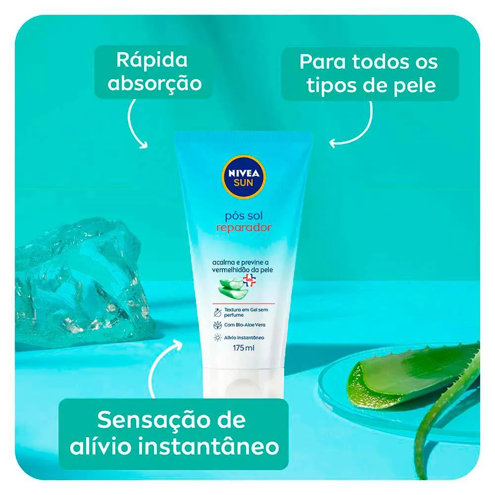 Com sua fórmula leve e refrescante de sensação suave, o NIVEA Sun Pós Sol Reparador causa alívio instantâneo na pele após o contato com o sol. Em gel e sem perfume, é apropriado para todos os tipos de pele.