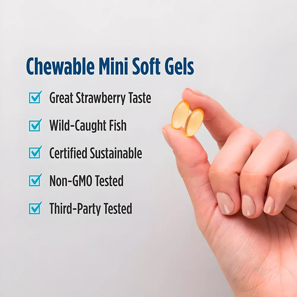 2. Cada embalagem contém 90 cápsulas mastigáveis, ricas em Ômega 3 (DHA e EPA), essenciais para o suporte da função cerebral e da visão em fase de crescimento, promovendo o bem-estar geral.