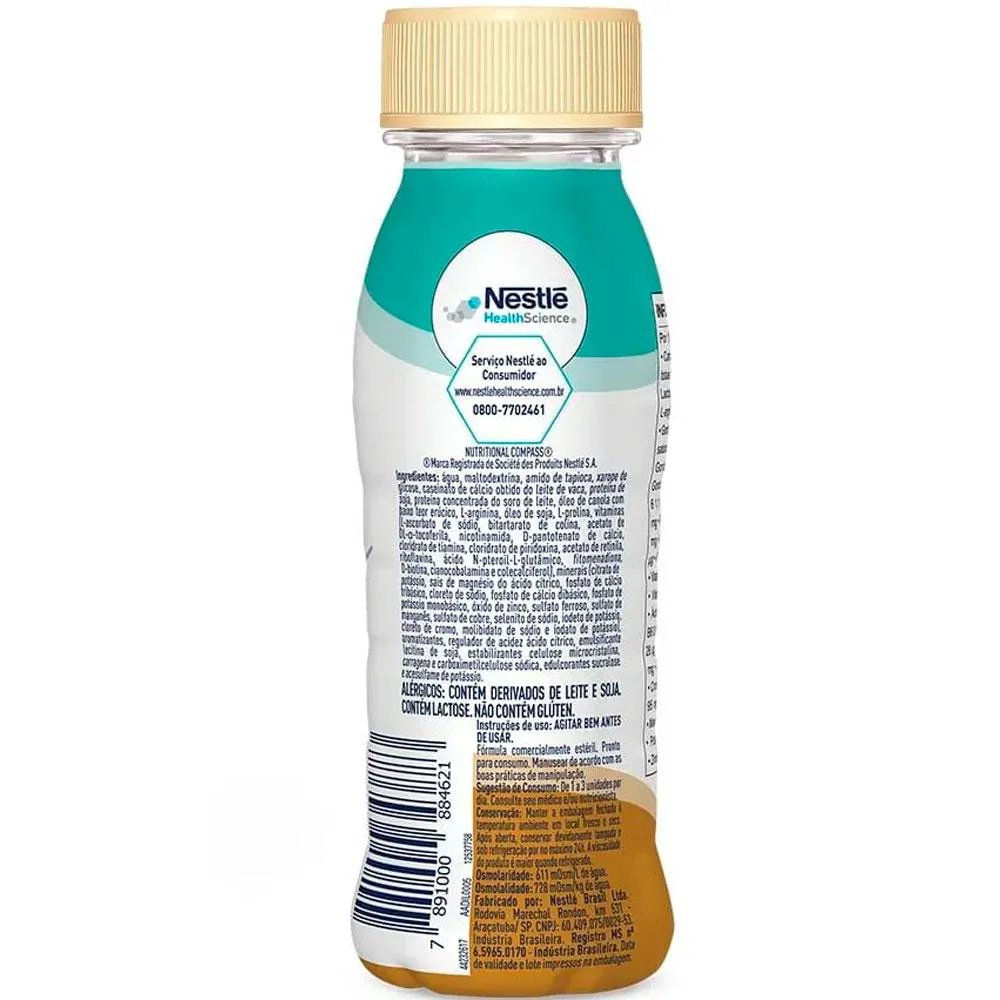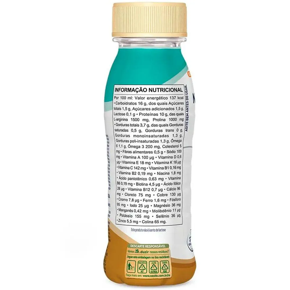 Água, maltodextrina, amido de tapioca, xarope de glicose, caseinato de cálcio obtido do leite de vaca, proteína de soja, proteína concentrada do soro de leite, óleo de canola com baixo teor erúcico, L-arginina, óleo de soja, L-prolina, vitaminas (L-ascorbato de sódio, bitartarato de colina, acetato de DL-alfa-tocoferila, nicotinamida, D-pantotenato de cálcio, cloridrato de piridoxina, cloridrato de tiamina, riboflavina, acetato de retinila, ácido N-pteroil-L-glutâmico, filoquinona, D-biotina, cianocobalamina e colecalciferol), minerais (sais de magnésio do ácido cítrico, cloreto de sódio, fosfato de cálcio dibásico, fosfato de cálcio tribásico, fosfato de potássio monobásico, óxido de zinco, sulfato ferroso, sulfato de manganês, sulfato de cobre, selenito de sódio, iodeto de potássio, cloreto de cromo e molibdato de sódio), estabilizantes citrato de potássio, celulose microcristalina, carragena e carboximetilcelulose sódica, regulador de acidez ácido cítrico, aromatizantes, emulsificante lecitina de soja, edulcorantes sucralose e acessulfame de potássio e antiespumante polidimetilsiloxano.
