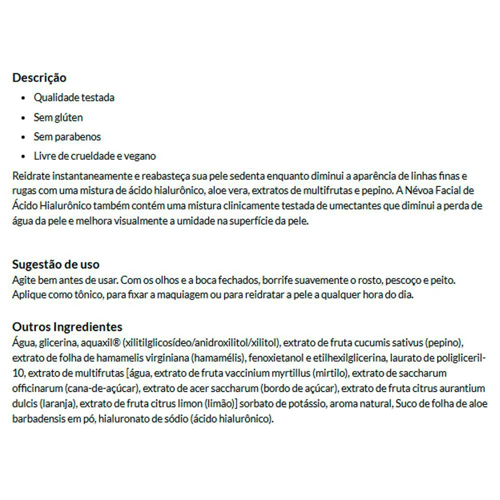 Enriquecido com ingredientes de alta qualidade, o Ácido Hialurônico da Now Foods nutre a pele além de hidratar. Livre de parabenos e sulfatos, este produto é formulado para ser gentil com a pele, enquanto proporciona os benefícios efetivos do ácido hialurônico em uma base diária. Validade longa