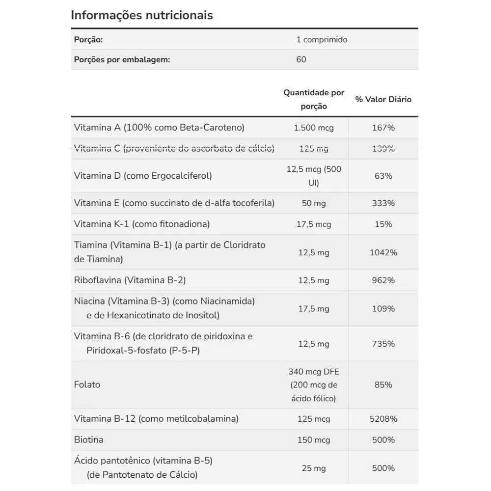 Cada tab contém nutrientes essenciais que auxiliam nas funções corporais normais e no metabolismo energético, garantindo suporte seguro e prático para o dia a dia, conforme padrões de qualidade Now Foods.