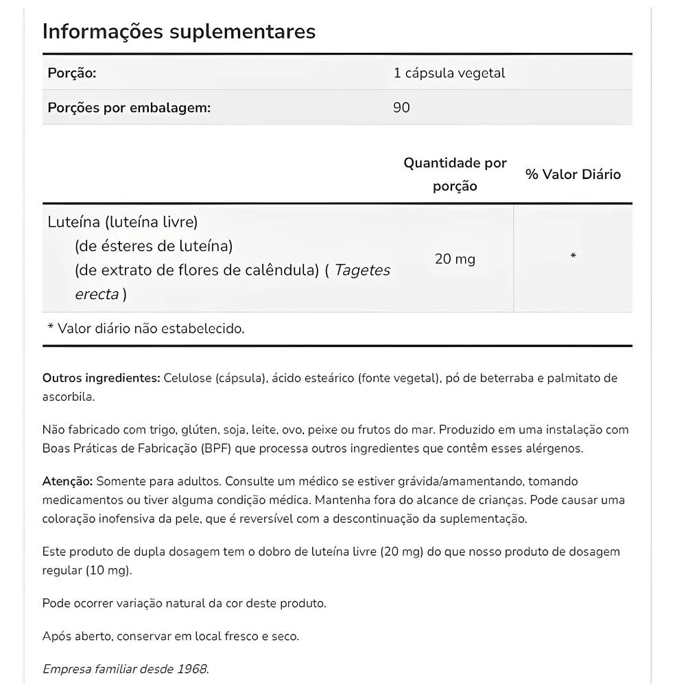O frasco contém 90 cápsulas, proporcionando uma dose prática e conveniente para o uso diário. As cápsulas são fáceis de ingerir, facilitando a inclusão do suplemento na rotina diária de cuidados com os olhos. Validade longa.