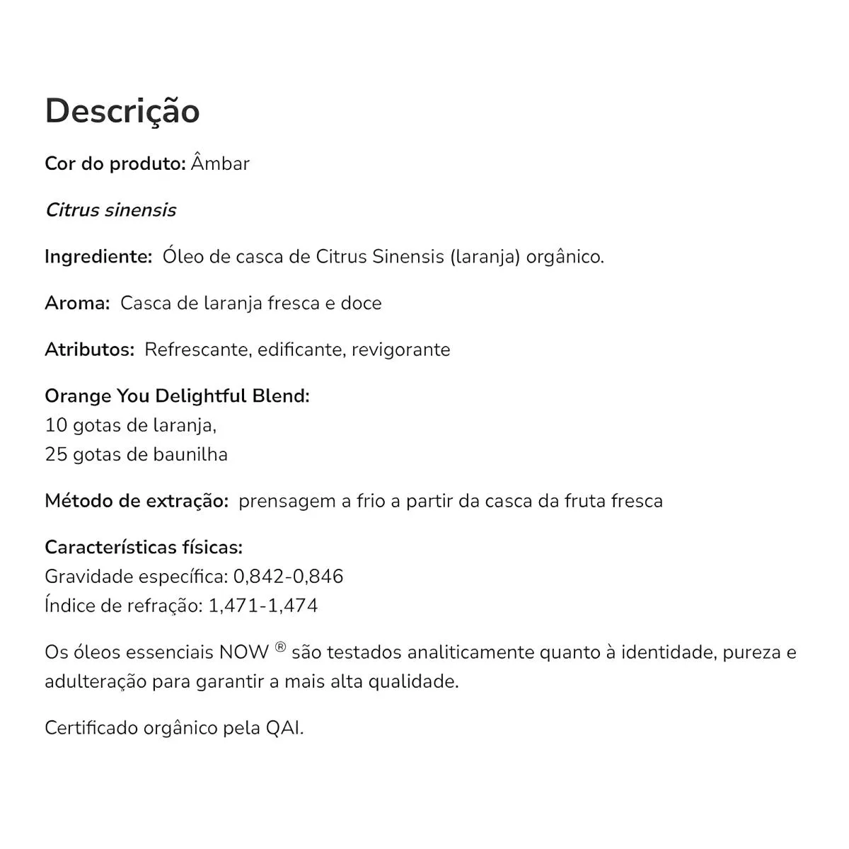 O Óleo de Laranja age no corpo através de suas propriedades aromáticas naturais. Quando inalado ou usado em difusores, ele pode ajudar a aliviar tensões, reduzir a fadiga e promover uma sensação de renovação mental e emocional, estimulando o relaxamento profundo.