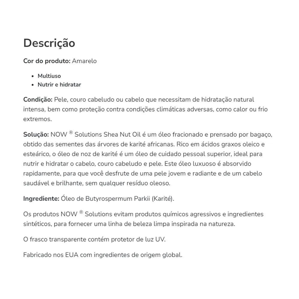 1. Principal Suporte: Desfrute dos benesses hidratantes do Óleo de Noz de Karité Now Foods, uma fonte natural de nutrição e cuidado para sua pele e cabelos.