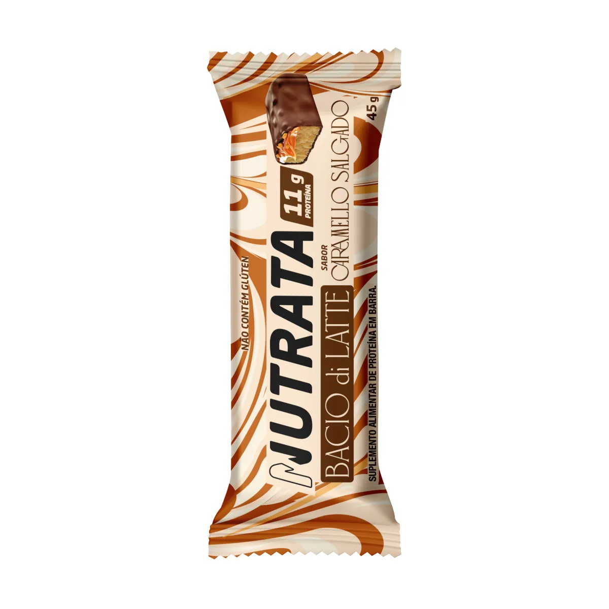 A Barra de Proteína Nutrata & Bacio Di Latte Caramello Salgado contém whey protein, crispies crocantes sabor caramelo salgado, recheio cremoso inspirado no gelato Caramello Salgado Bacio di Latte, cobertura sabor chocolate meio amargo e aromatizante sintético idêntico ao natural. Não contém glúten. Contém lactose.
