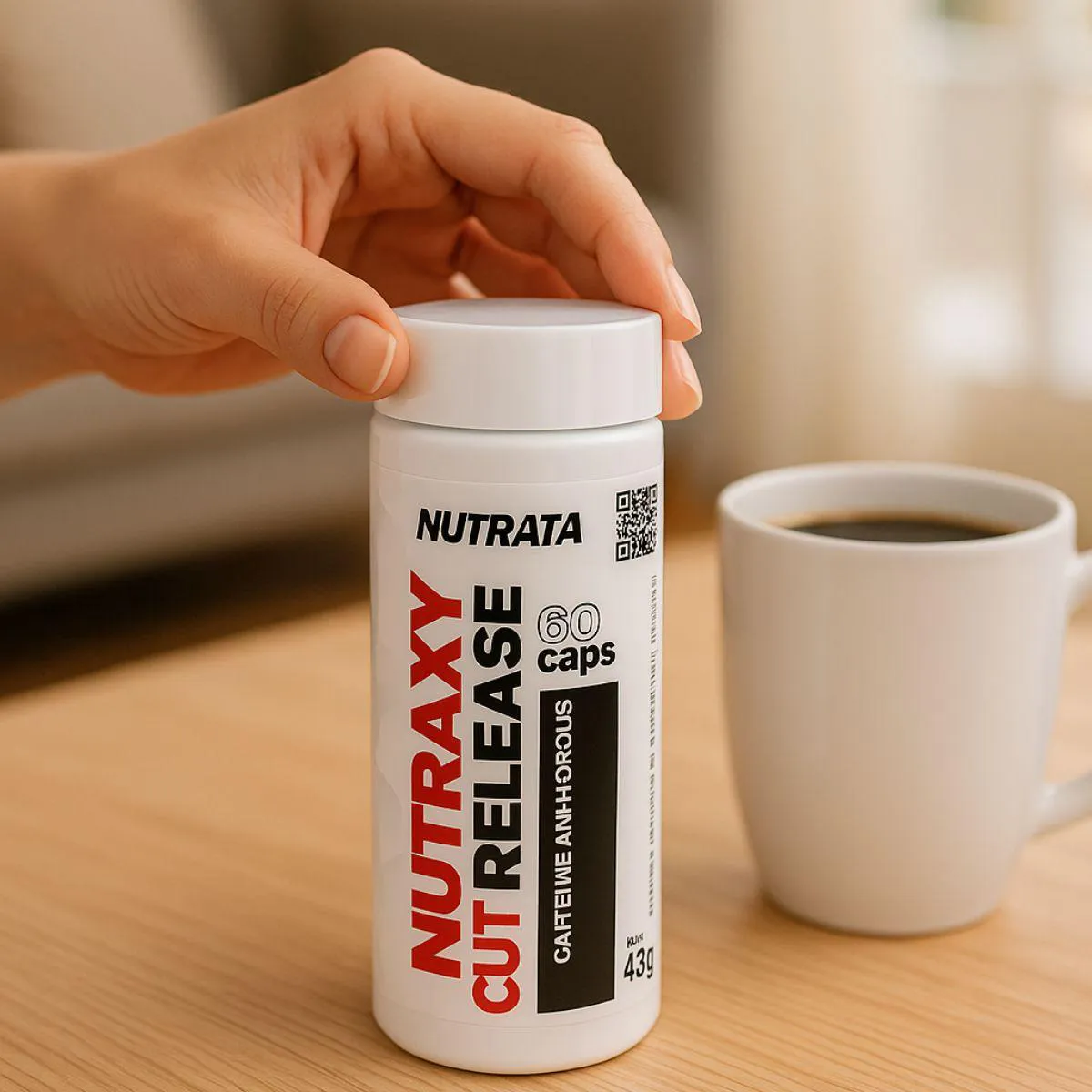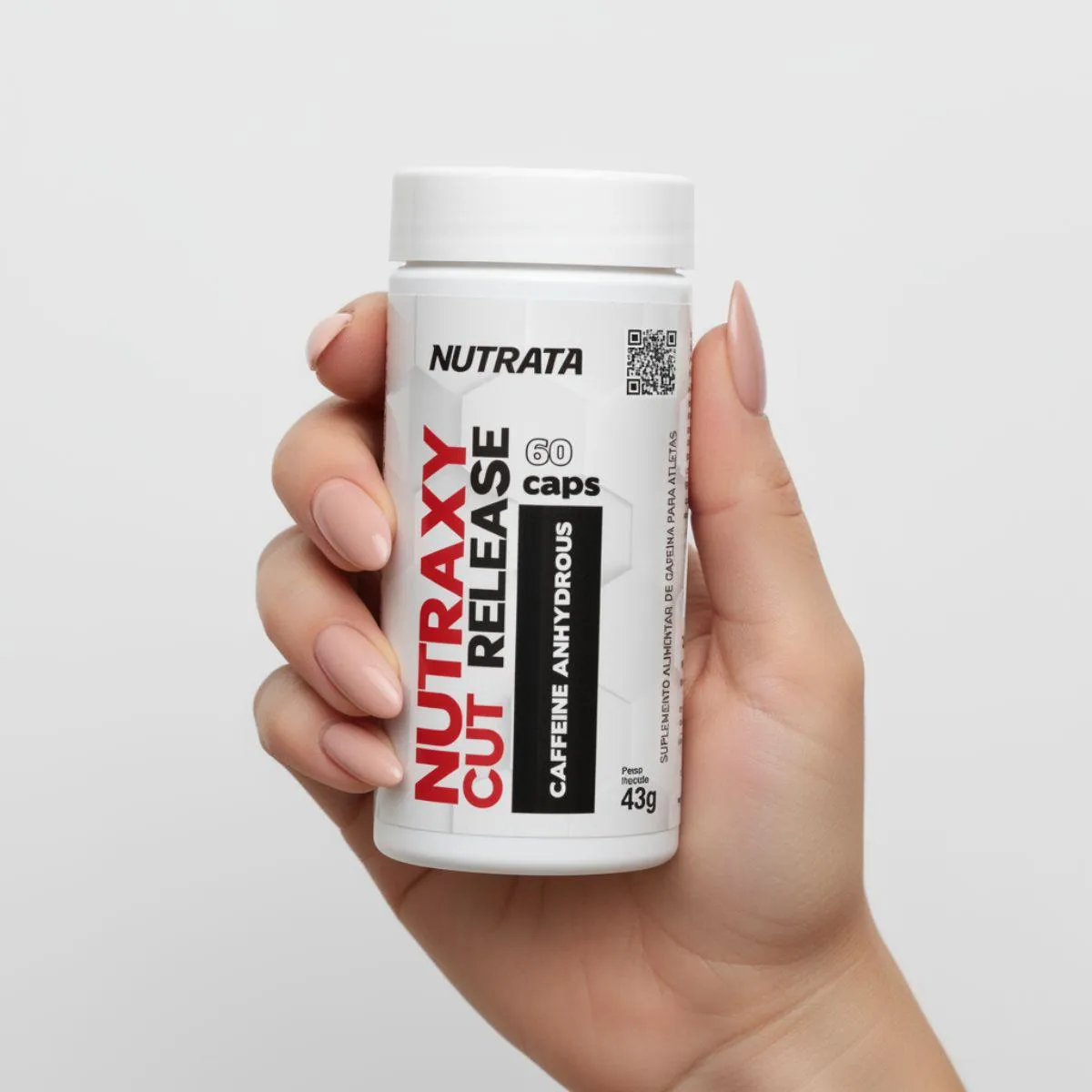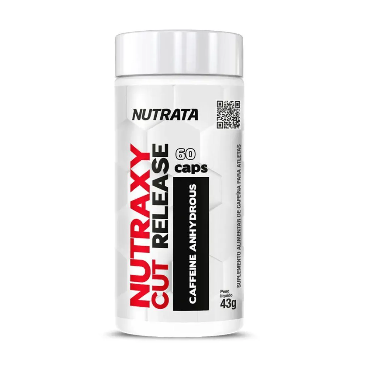 Nutraxy Cut Release Caffeine 200mg 60 Capsulas Nutrata cápsulas com 200 mg de cafeína de liberação gradual, frasco com 60 unidades.