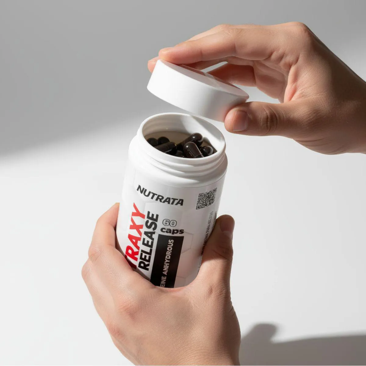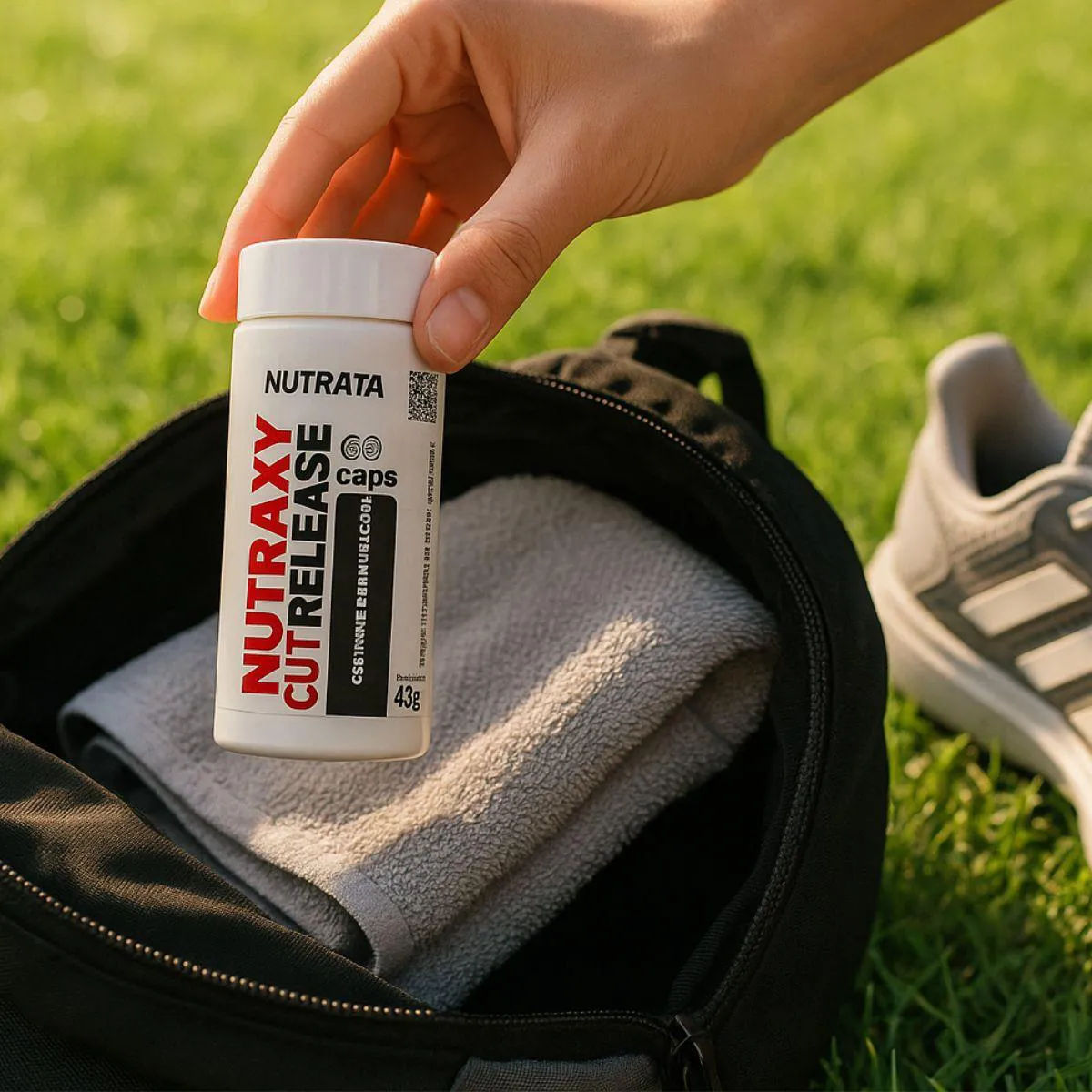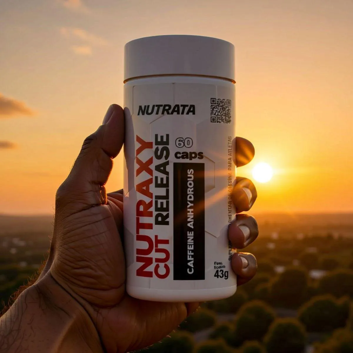 Nutraxy Cut Release Caffeine 200mg 60 Capsulas Nutrata cápsulas com 200 mg de cafeína de liberação gradual, frasco com 60 unidades.