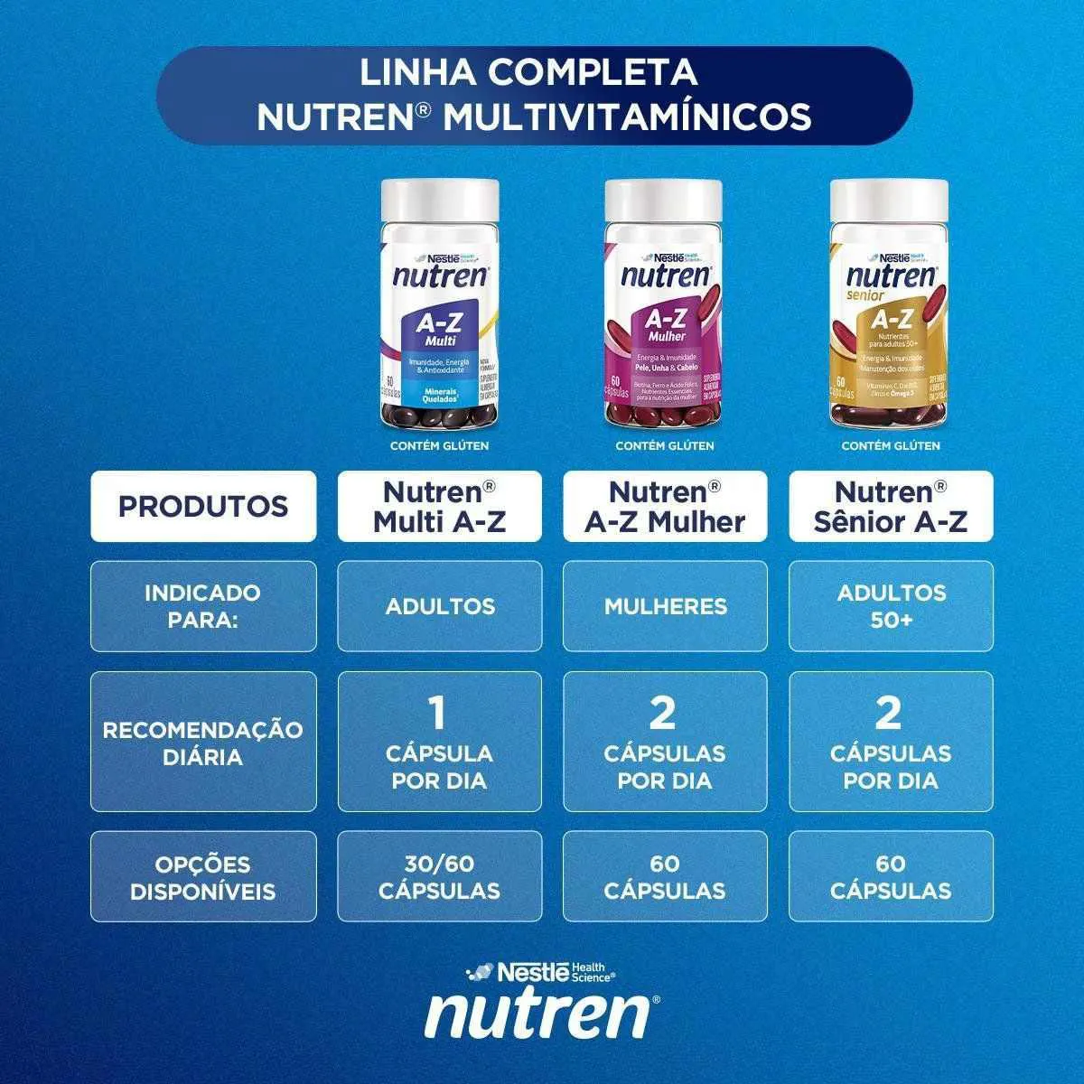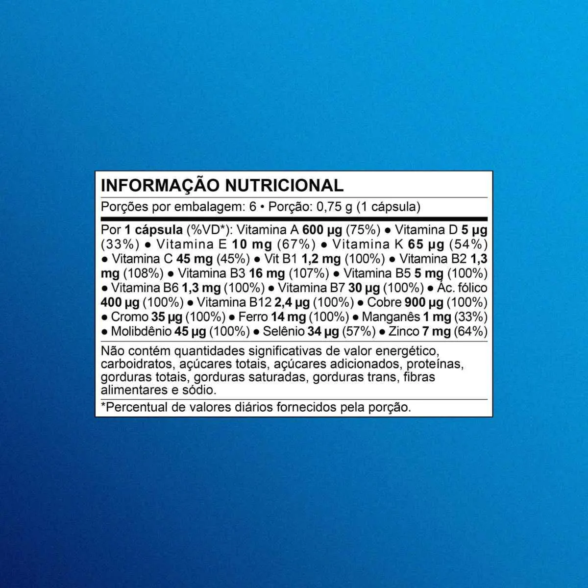Multivitamínico e mineral com nutrientes essenciais que auxiliam no funcionamento do sistema imune*e no metabolismo energético**. Com antioxidantes que auxiliam na proteção dos danos causados pelos radicais livres***. *Vitaminas B6, B12, A, C, D e ácido fólico e minerais ferro, zinco e selênio. / **Vitaminas B1, B2, C, B6, B12, niacina e ácido pantotênico e mineral ferro. ***Vitaminas C, E e B2 e minerais zinco e selênio.