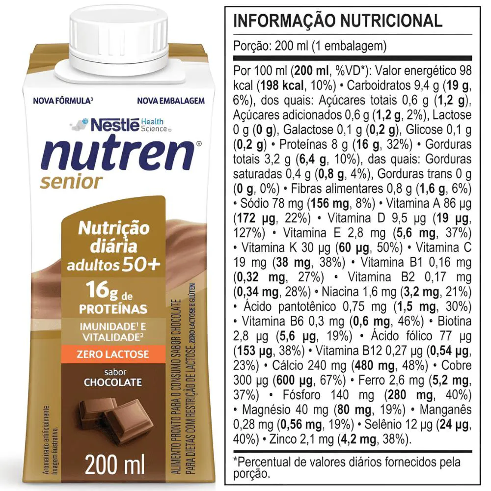 O Nutren Senior Pronto 200ml é um suplemento nutricional desenvolvido especialmente para adultos acima de 50 anos que desejam manter força, energia e qualidade de vida no dia a dia. Sua fórmula contém 16g de proteína por unidade, além de cálcio e vitamina d, nutrientes fundamentais para a manutenção da massa muscular e saúde óssea. Também oferece 19 vitaminas e minerais que auxiliam no funcionamento do organismo, incluindo vitaminas do complexo B, vitamina c e zinco. Prático e pronto para consumo, não precisa de preparo. Basta abrir e beber. Ideal para complementar a alimentação, especialmente para quem possui rotina corrida, baixa ingestão proteica ou precisa reforçar a nutrição diária. Uma solução equilibrada, prática e nutritiva para apoiar um envelhecimento mais ativo e saudável. • ? 16g de proteína por unidade: ajuda na manutenção e recuperação da massa muscular, essencial após os 50 anos. • ? Cálcio + Vitamina D: contribuem para a saúde dos ossos e músculos, auxiliando na mobilidade e qualidade de vida. • ?️ 19 vitaminas e minerais: fórmula completa com vitaminas do complexo B, vitamina C e zinco para suporte imunológico e energia diária. • ? Pronto para beber – praticidade total: embalagem Tetra Slim 200ml, ideal para levar na bolsa, consumir entre refeições ou complementar a alimentação. • ? Zero lactose e sem glúten: opção adequada para intolerantes à lactose (não é isento de leite). Esse produto não é um Medicamento, não tem como objetivo auxiliar no tratamento, cura ou combate de qualquer doença