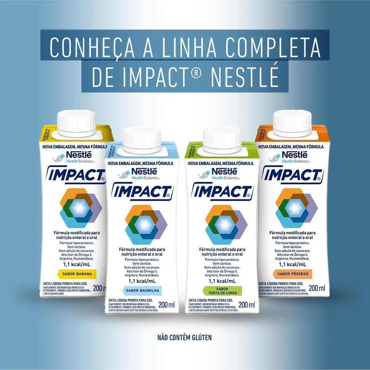 Fórmula modificada para nutrição enteral e oral com arginina e nucleotídeos e com alto teor de ácidos graxos ω-3, normocalórica¹ e hiperproteica¹. sem lactose e sem adição de sacarose. Sabores torta de limão, pêssego, banana e baunilha – sleeve 200ml.