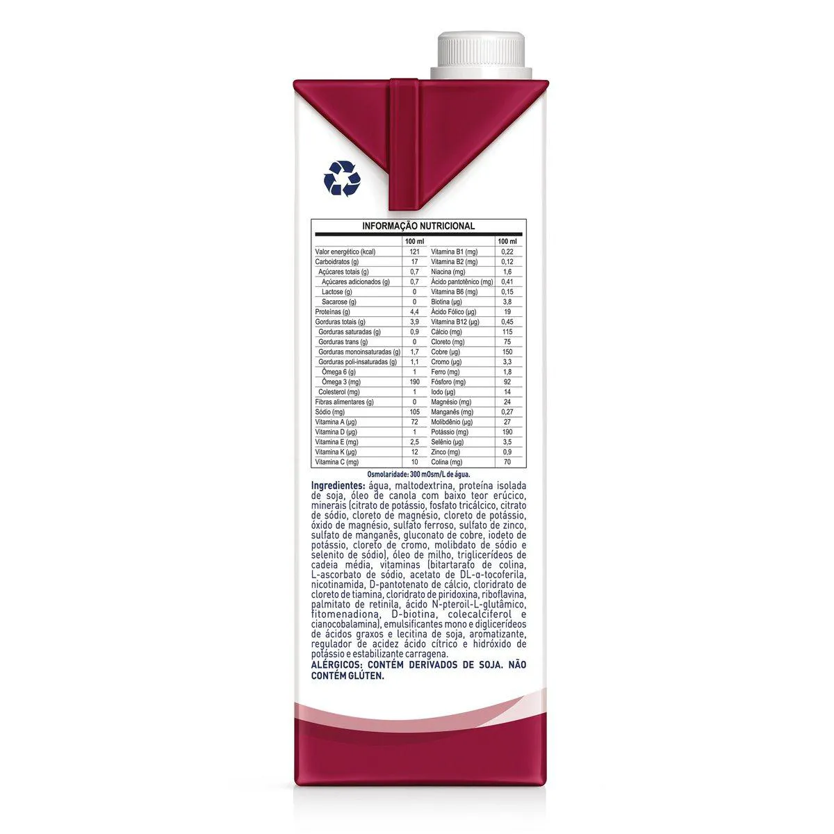 Fórmula normocalórica, normoproteica e normolipídica, 100% proteína isolada de soja do total de proteínas e fonte de vitaminas e minerais. Sem adição de sacarose e isenta de lactose.