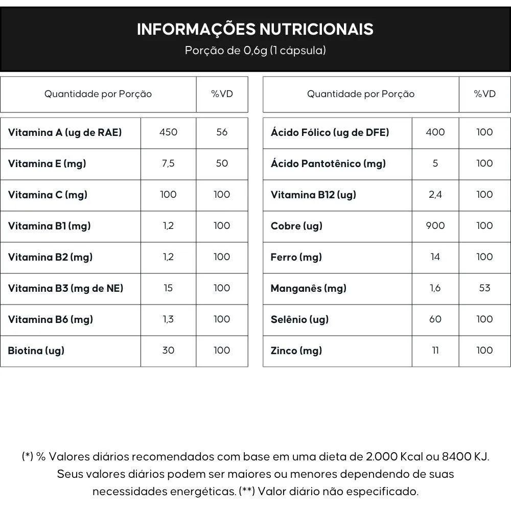 Ácido ascórbico (Vit. C), niacinamida (Vit. B3), bisglicinato ferroso (Ferro), sulfato de zinco monoidratado (Zinco), acetato de DL-alfa-tocoferol (Vit. E), D-pantotenato de cálcio (Ácido pantotênico), acetato de retinol (Vit. A), cloridrato de piridoxina (Vit. B6), tiamina mononitrato (Vit. B1), riboflavina (Vit. B2), bisglicinato de manganês (Manganês), sulfato cúprico (Cobre), ácido fólico, selenito de sódio (Selênio), D-biotina (Biotina), cianocobalamina (Vit. B12). Antiumectantes: silicato de magnésio e dióxido de silício; Cápsula: Gelificante: gelatina; Corantes: dióxido de titânio, eritrosina e azorrubina. NÃO CONTÉM GLÚTEN.