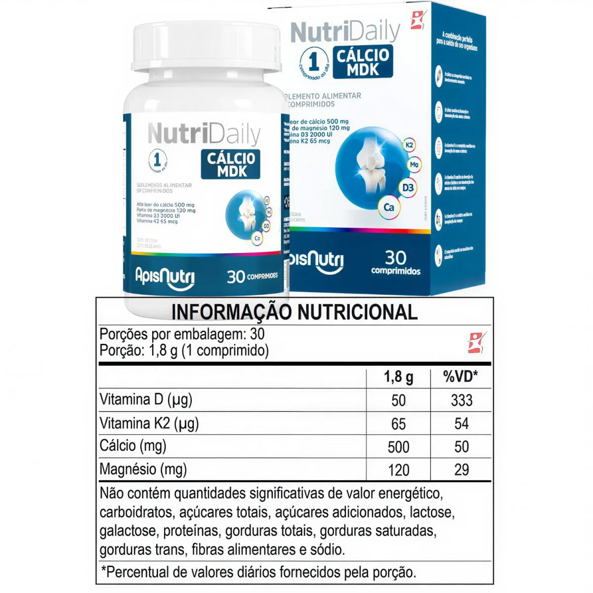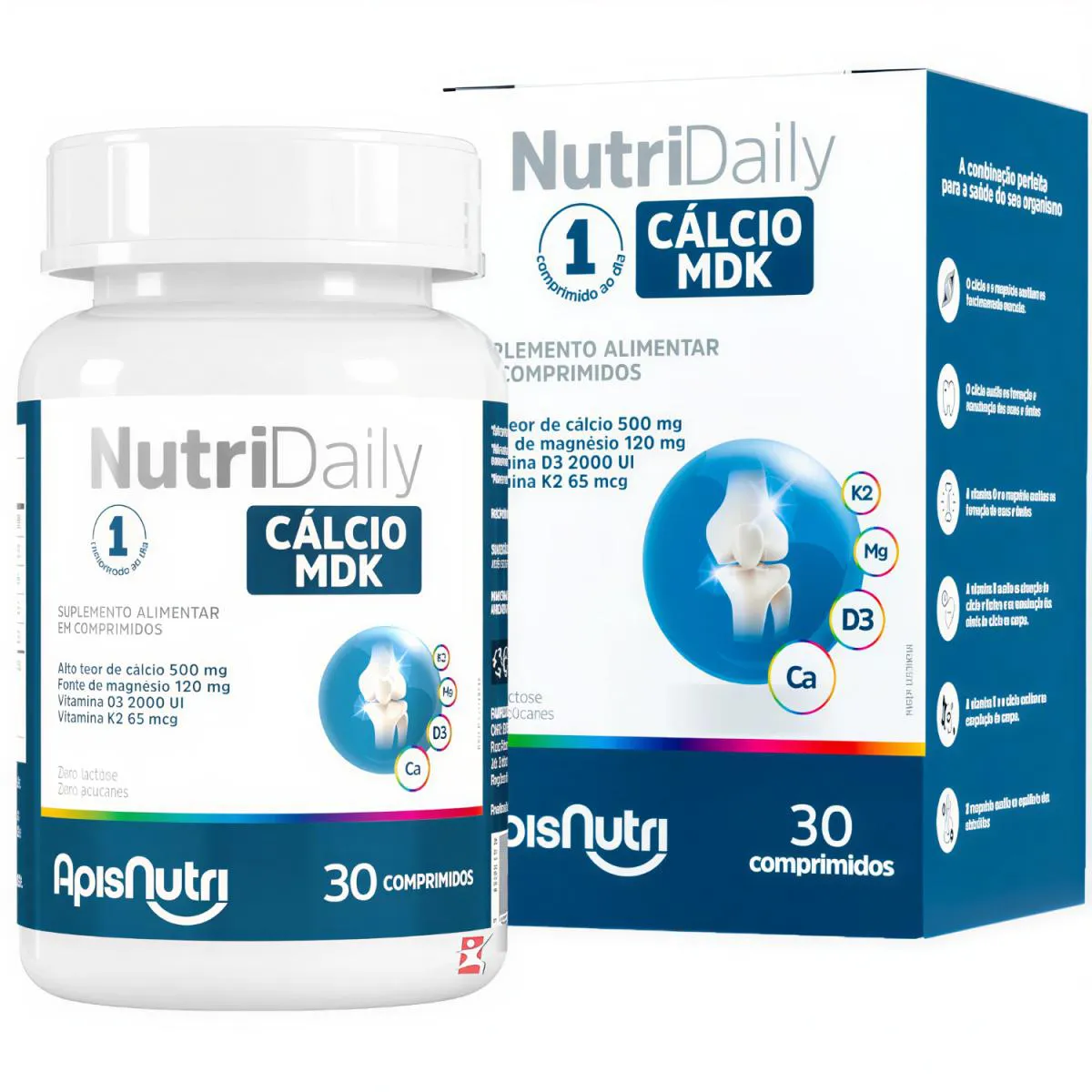 Nutridaily Calcio Mdk - Cálcio + Magnésio + Vit. K2 + Vit. D3 30 Comprimidos 1 ao Dia - Apisnutri