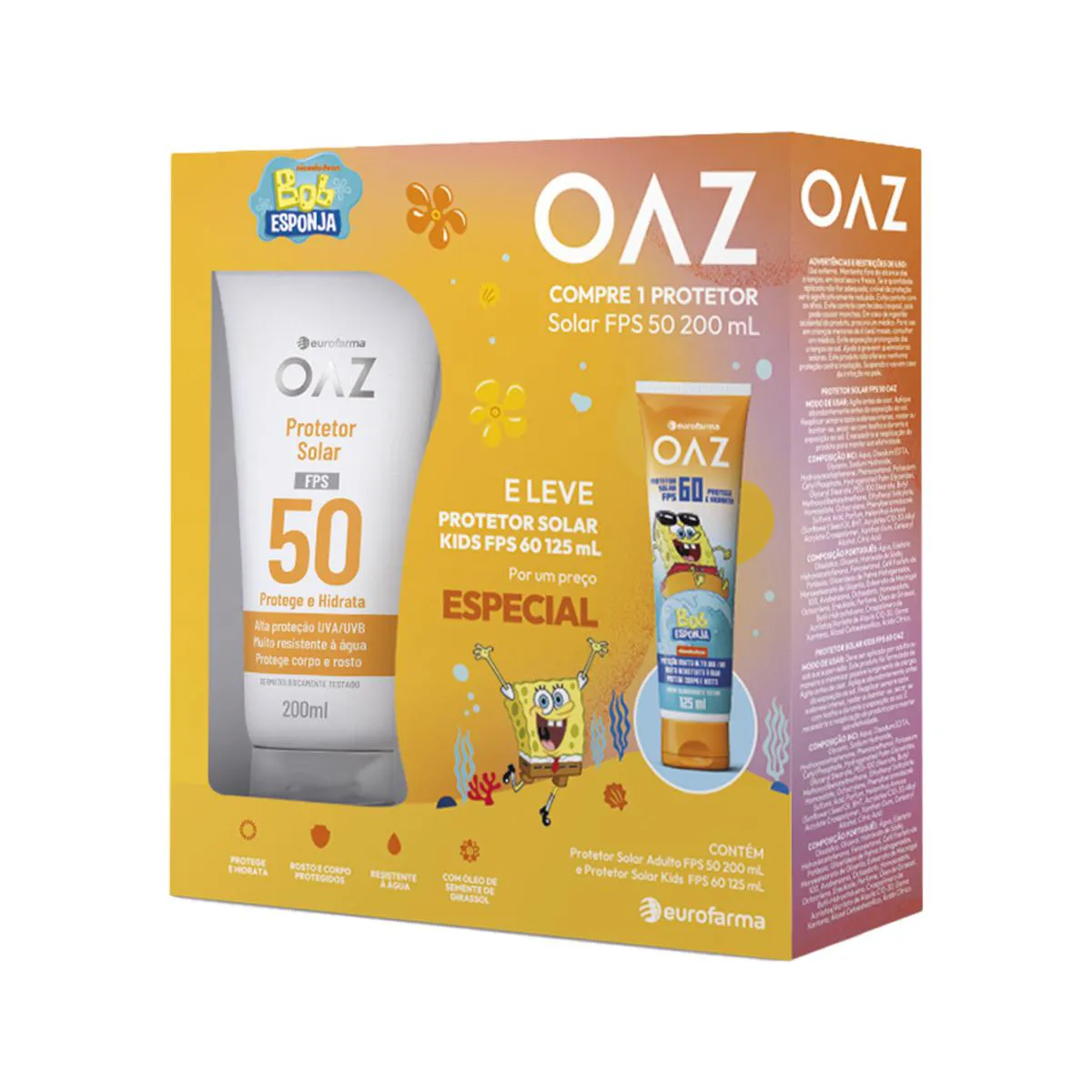 O Kit OAZ Protetor Solar Adulto FPS 50 + Kids FPS 60 foi desenvolvido para proteger a pele do rosto e do corpo contra os efeitos nocivos dos raios UVA e UVB. Com fórmula oil free, proporciona toque seco, hidratação e conforto, sendo ideal para uso diário. Além de muito resistente à água e ao suor, é vegano, livre de parabenos e dermatologicamente testado.