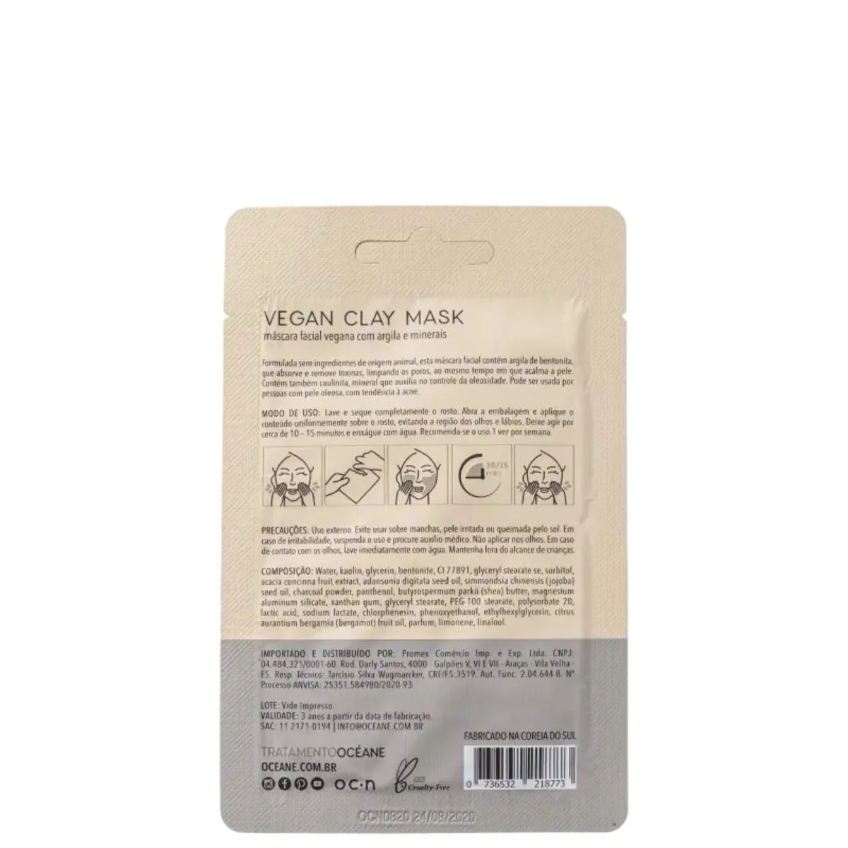 Máscara Facial Océane Vegan Clay conta com fórmula vegana e traz uma combinação de ingredientes naturais para deixar a pele limpa, livre de toxinas e resíduos, além de proporcionar ação calmante. Pode ser aplicada em todos os tipos de pele, inclusive com tendência à acne.