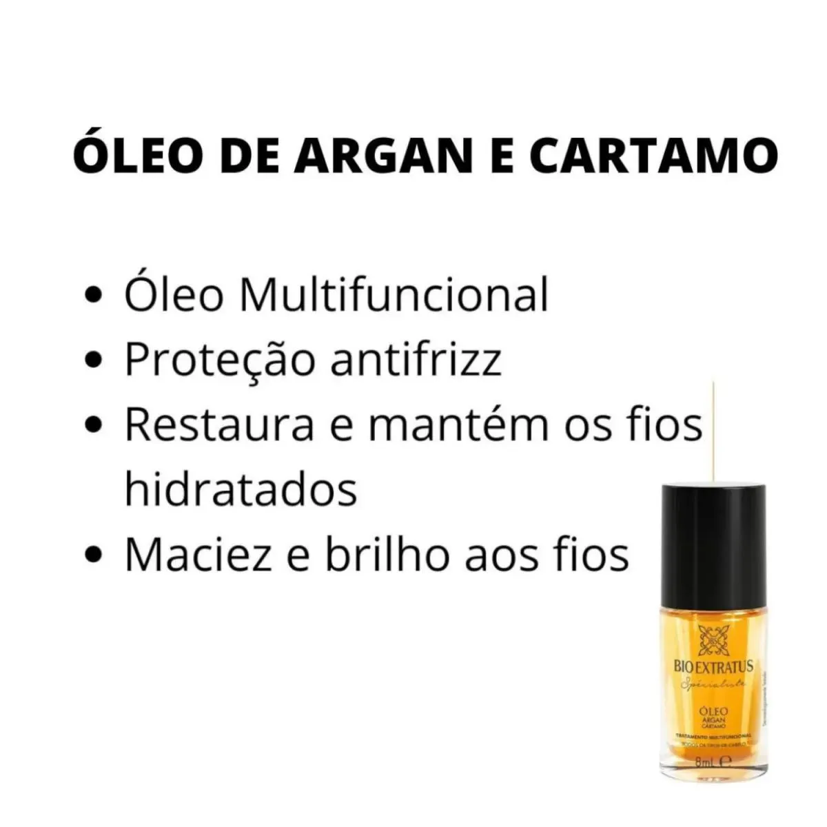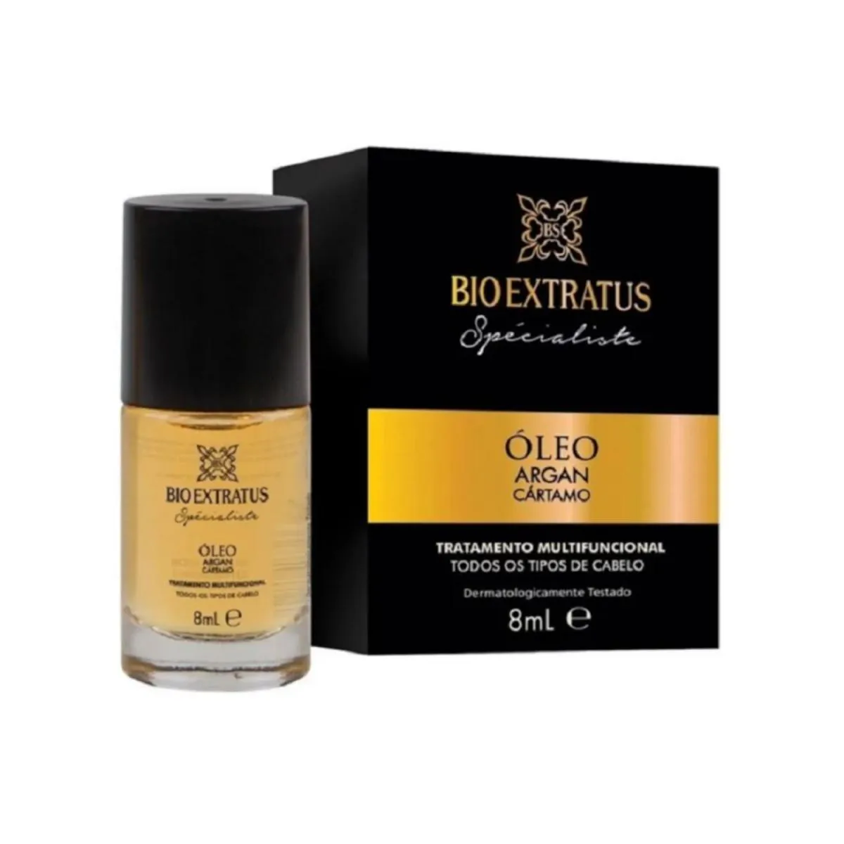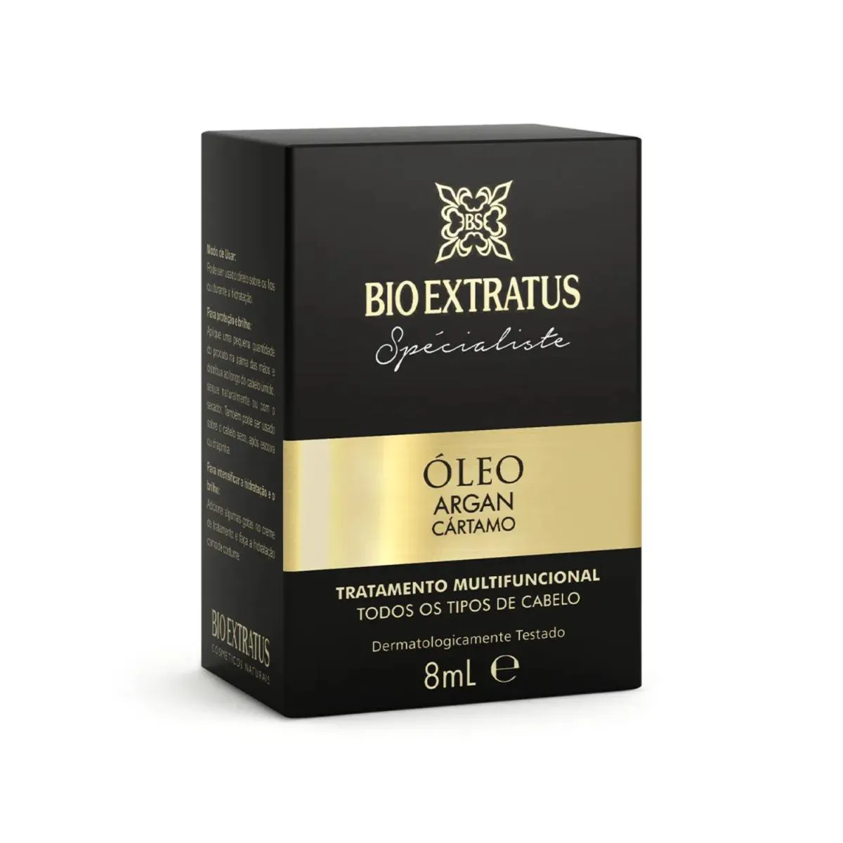 Óleo Argan e Cártamo Specialiste 8ml – Bio Extratus O Óleo Argan e Cártamo Specialiste da Bio Extratus é um tratamento intensivo em dose única que oferece nutrição, reparação e brilho imediato aos cabelos. Enriquecido com óleos nobres, ele combate o ressecamento, sela as pontas e protege os fios das agressões externas, deixando-os mais saudáveis e radiantes.