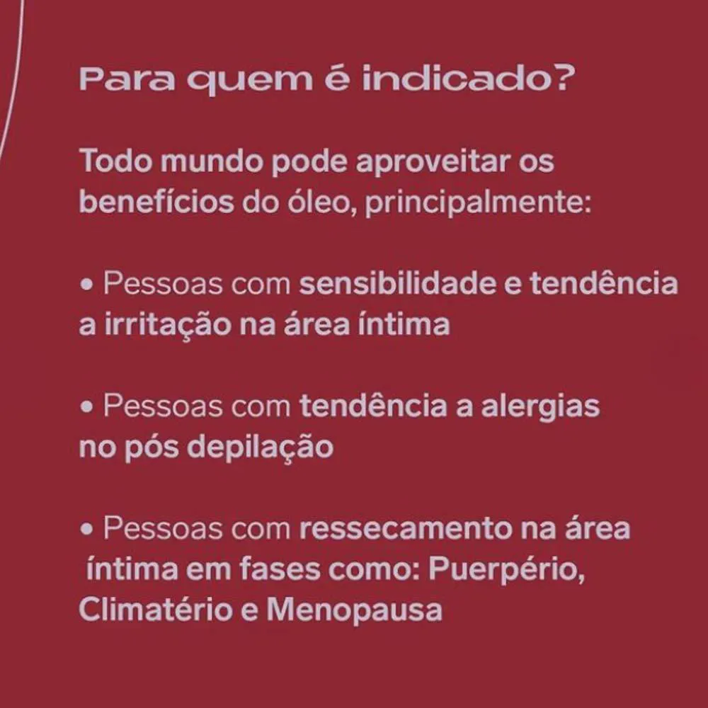 O Óleo Calmante Feel também é o auxiliar perfeito para suavizar os incômodos que podem ocorrer após a depilação, assaduras e prevenir aquelas bolinhas que surgem no bumbum, axilas e outras áreas.