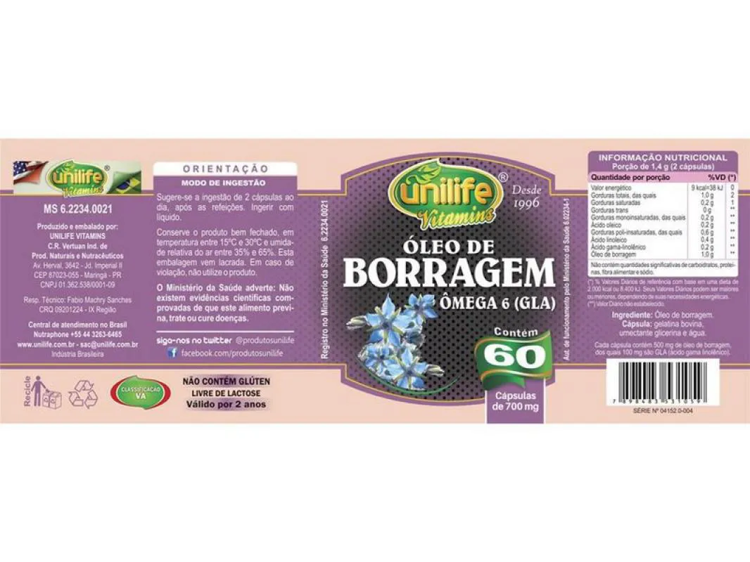 Óleo de Borragem Unilife 60 Cápsulas O Óleo de Borragem Unilife Vitamins é um suplemento BIOKOSHER, desenvolvido a partir da extração do óleo de borragem com prensagem a frio. Livre de glúten. Características: - Livre de Glúten. Modo de Uso: Sugere-se a ingestão de 2 cápsulas ao dia, após as refeições. Ingerir com líquido. Ingredientes: Óleo de borragem. Cápsula: gelatina bovina, umectante glicerina e água. NÃO CONTÉM GLÚTEN. Avisos: - Este produto não é um medicamento.