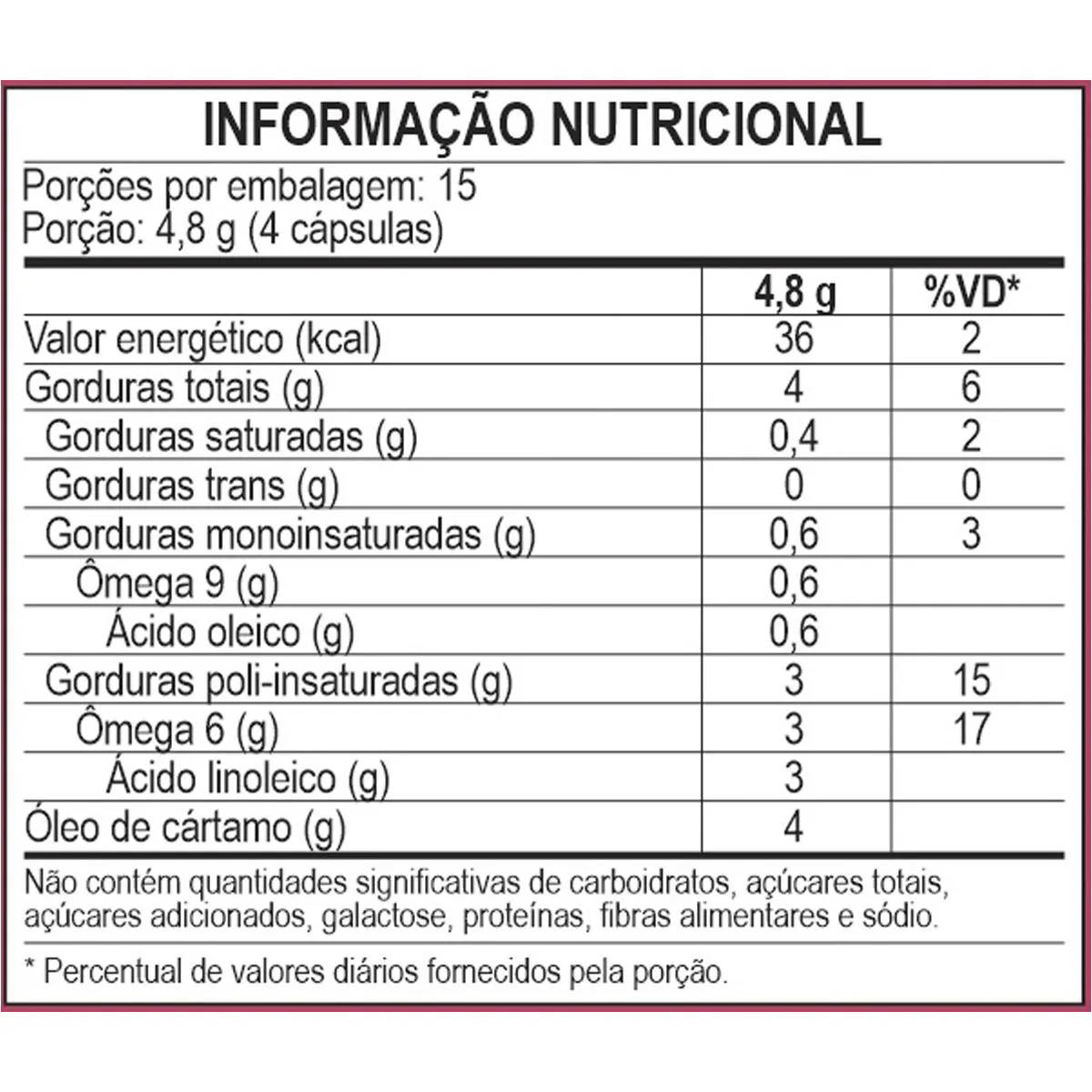 Não contém lactose. Cada cápsula contém um peso total de 1200mg, dos quais 1000mg são de óleo de cártamo. Produto autorizado para comercialização em todo o território nacional através do anexo I da RDC 240/2018 da ANVISA.